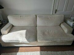 Beautiful solid sofa in a colefax fabric. Frame in good condition but may need reupholstering (see second photo). We padded out the cushions with extra foam inserts but they probably need to be redone properly. Note: the Kingcome label has fallen off but it should be clear from the quality and measurements which sofa this is. From the website: 2.5 SEATER Width: 210cm Depth: 96cm Back Height: 75cm Arm Height: 55cm Approx Qty Fabric: 15.5m Price From: £5,395 Collection only from Peckham Rye. It is extremely heavy so will need two people to collect.