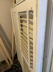 1. Seven window shutter blinds for sale. Coated wood, painted in white. The blinds are of varying sizes with the smallest being 156cm x 96cm and the largest being 190cm x 99cm. £100 each.