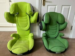 1. My children have grown out their car seats. When we bought them these seats were the top which? recommended product. They provide premium safety and are extremely comfortable, adjustable to grow which the child and designed up to age 12. Both covers have just been washed. The mid green one is in excellent condition and I'd like £40 for it. The light green fabric has some stains which haven't come off in the wash so I'd take £30 for it. Never been in an accident and great for comfort on long journeys where the children like to rest their heads to sleep. The photo shows how the seat can be adjusted as I've got one on the smallest setting and one on the largest setting in the photo. Both have an instruction manual included.