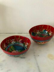 Vintage Hand Painted Birds Wood Bowl Blue Red Bird Mexico Folk Art Set Of 2. Photos include back and front both sides are hand painted. Sides are slightly bent. (The small one is 12 cm and the big one is 13 cm) £10