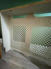 1. One painted wooden radiator cover. Total height (including top ledge): 83 cm Top ledge: 102 x 20 cm Body (below the top ledge): 98 x 19.5 cm Note: one side has small cut outs because of placement by window sill and radiator pipe.