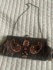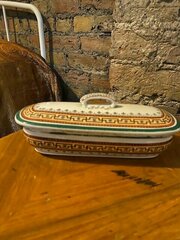 This pretty white Victorian oblong bowl has green, black, yellow and red painted patterns on the lid and body. It is marked as being made in 1886 and has an embossed marking saying 13 and something else which is difficult to read. It is a container for small items of jewellery or buttons or sweets £10