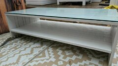 Tabletop that's made of glass. The dimensions are 120 I have this stylish unique coffee table from Moda furnishings, it has a few blemishes as you can see from the photographs. However, a little bit of white metal paint exterior should be able to cover this up quite nicely if it bothers you that much. However, it's a very sturdy coffee table and was expensive when first purchased. It comes with tabletop glass which the whole thing measures 120 cm by 60 cm by 48 cm high. £60ono