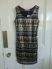 1) Sequinned bodycon dress in black / gold / silver. Brand new, with tags. Can be dressed up or down (with jackets / coats) as needed, looks stunning. Size S, will fit 6 /8. Looking for £8
