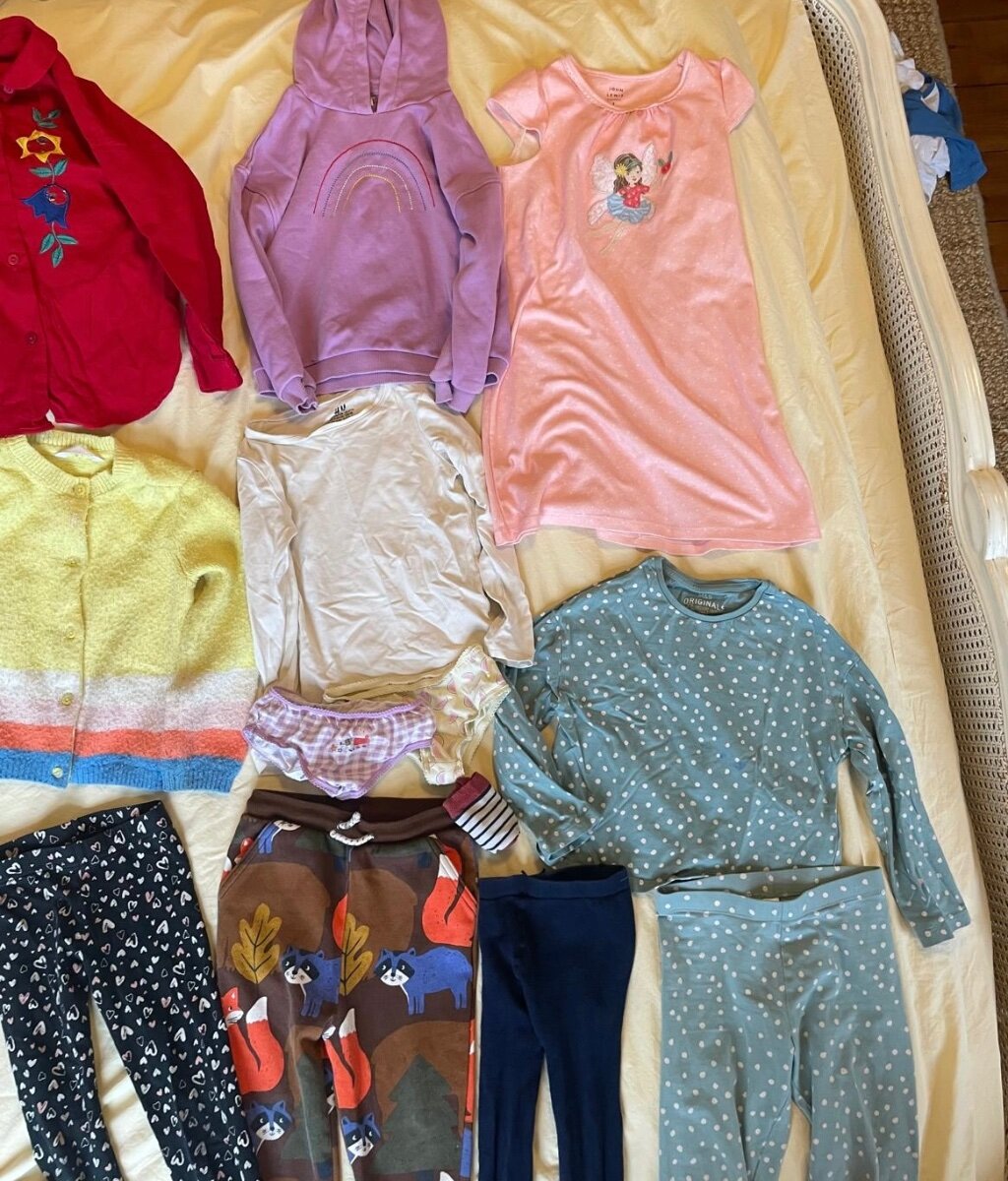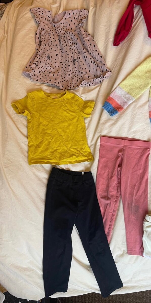 items include: hoodie, shirt, tights; leggings; cardi; T-shirt; long-sleeved T-shirts; knickers (barely worn)