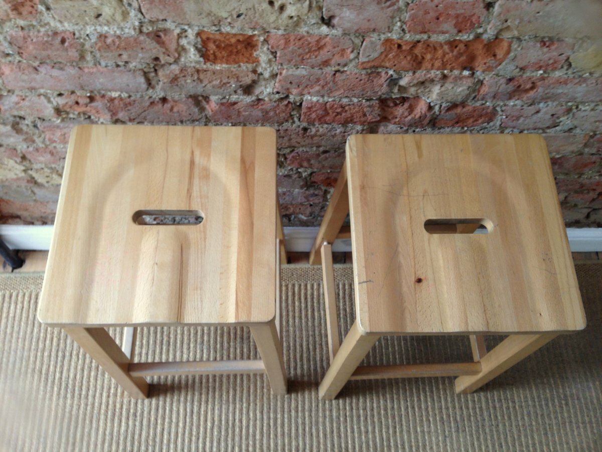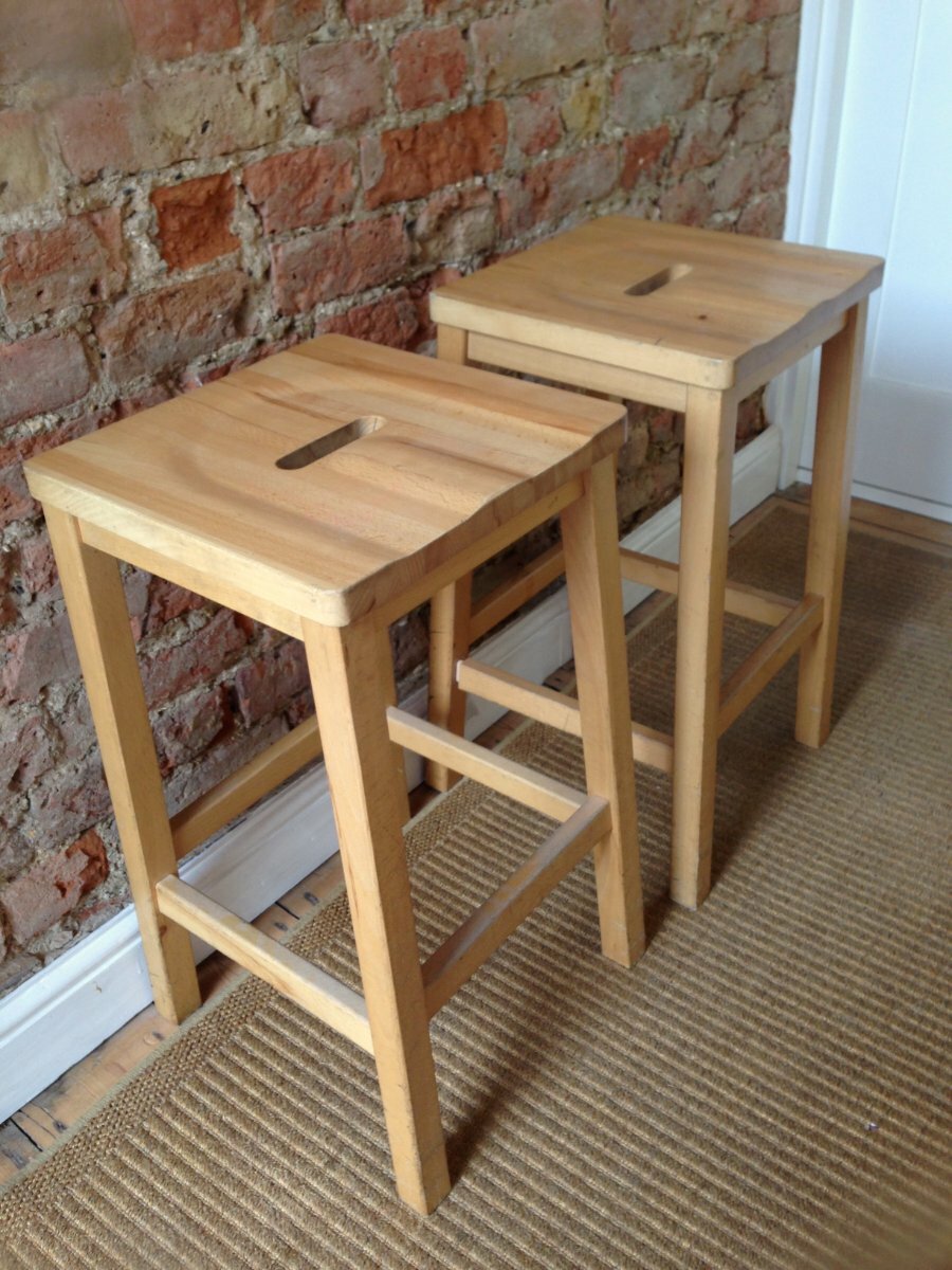 Mellow pine colour these stools are useful and sturdy.
