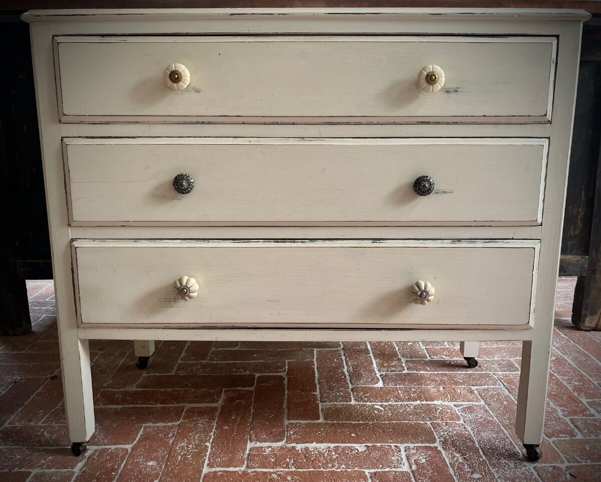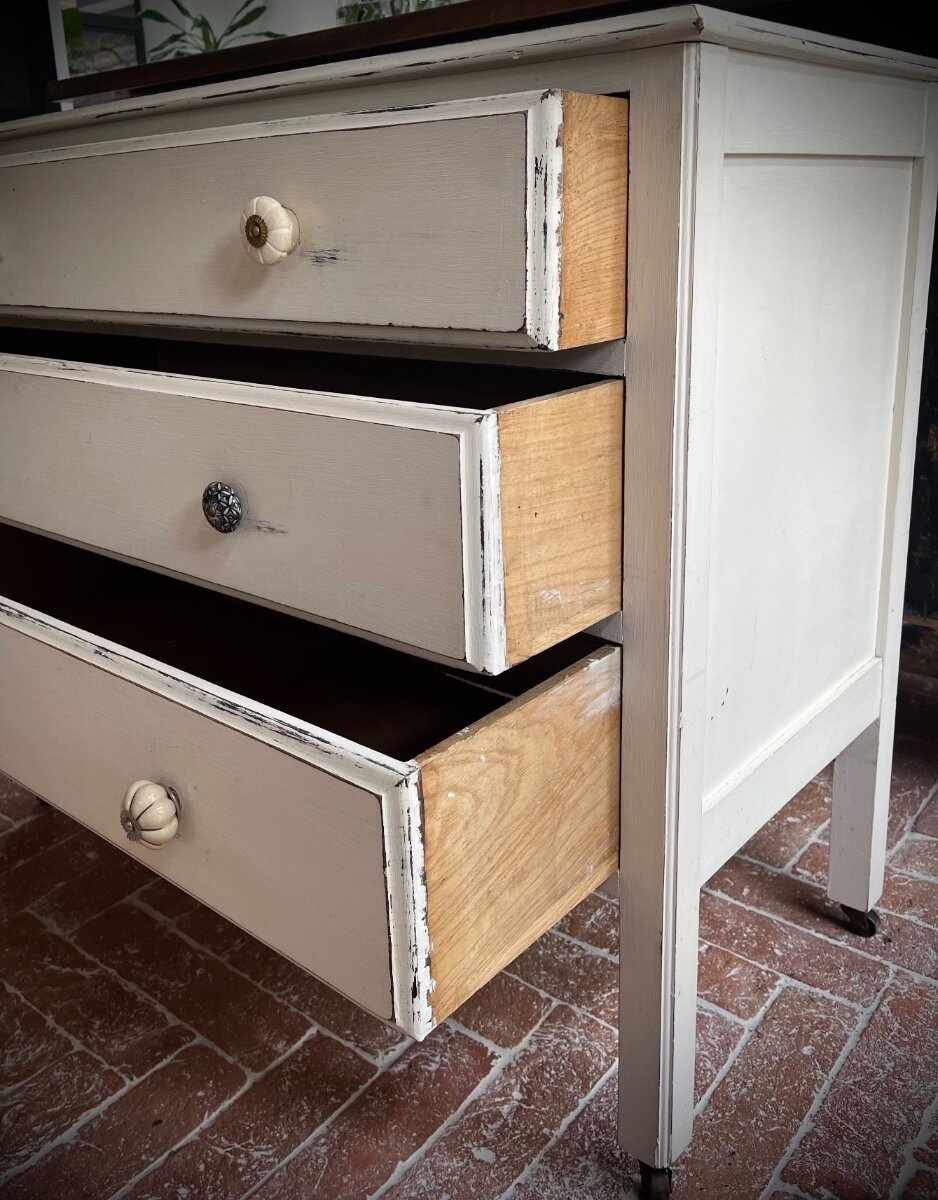 The drawers are on casters. Could do with a freshen up as there are some marks here and there.