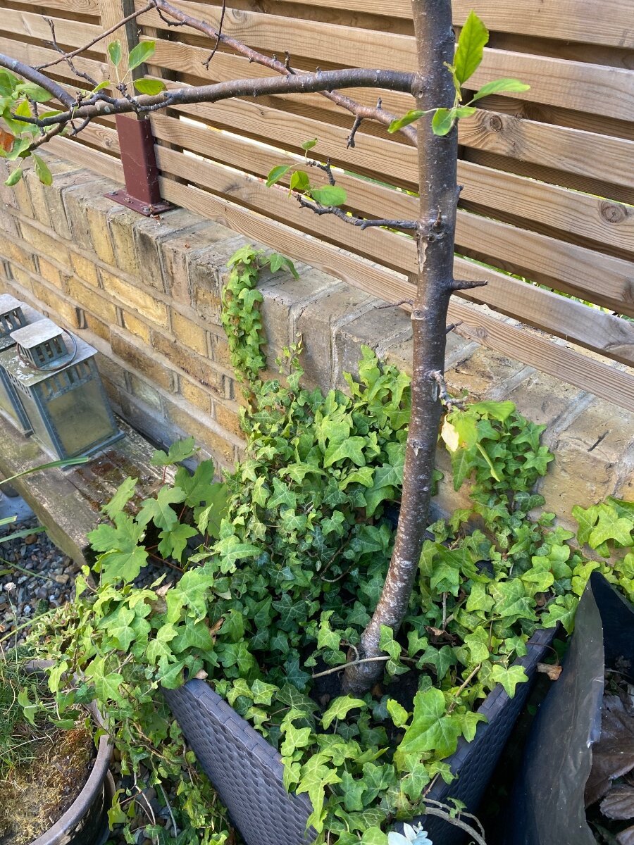 This tree is potted but would be  happier to be planted in the ground and  pruned.