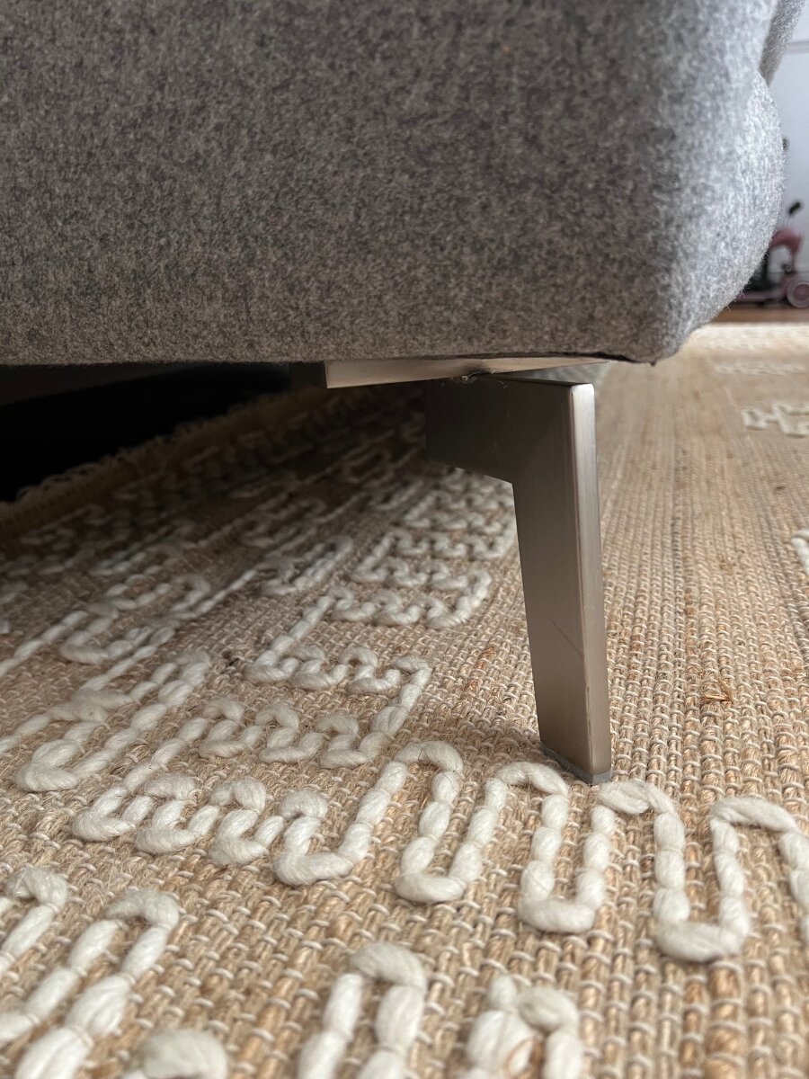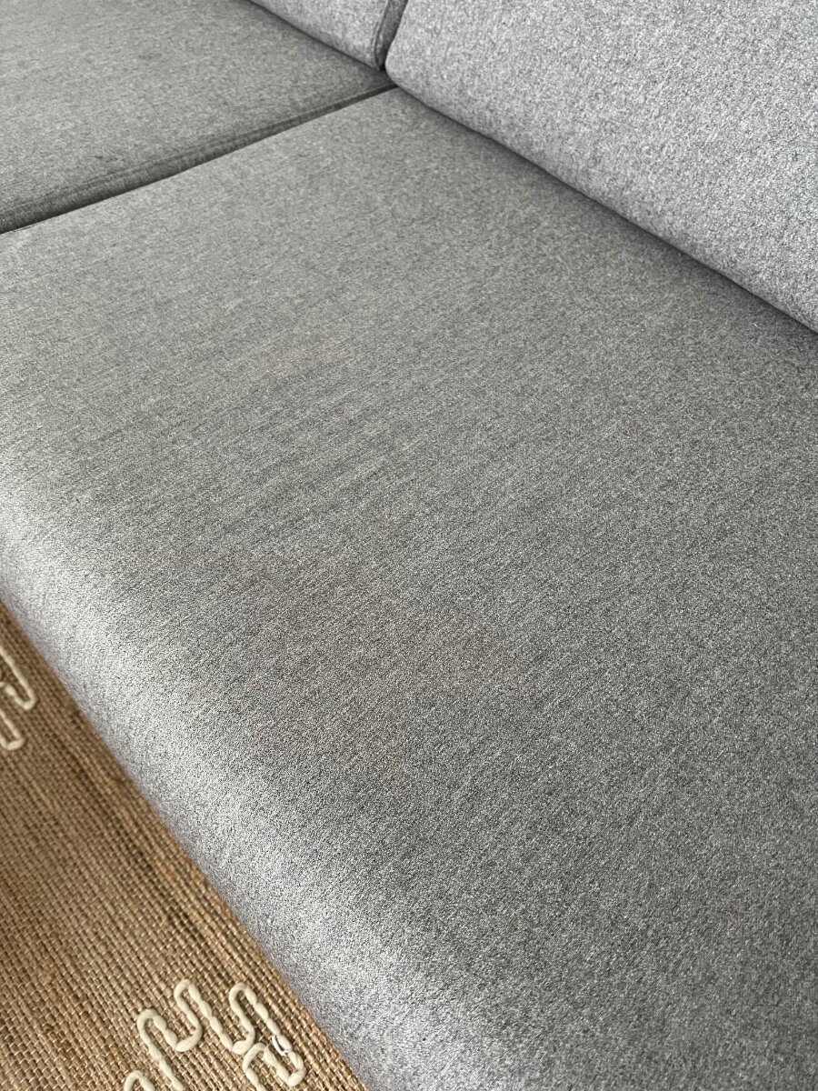 The fabric is a light/medium grey felt-type fabric. Because of the nature of the fabric it is slightly worn on the seat cushions (see photos), but it still has lots of life in it. The cushions are foam filled so keep their shape well. The seat and back cushion covers are removable. It has metal legs.