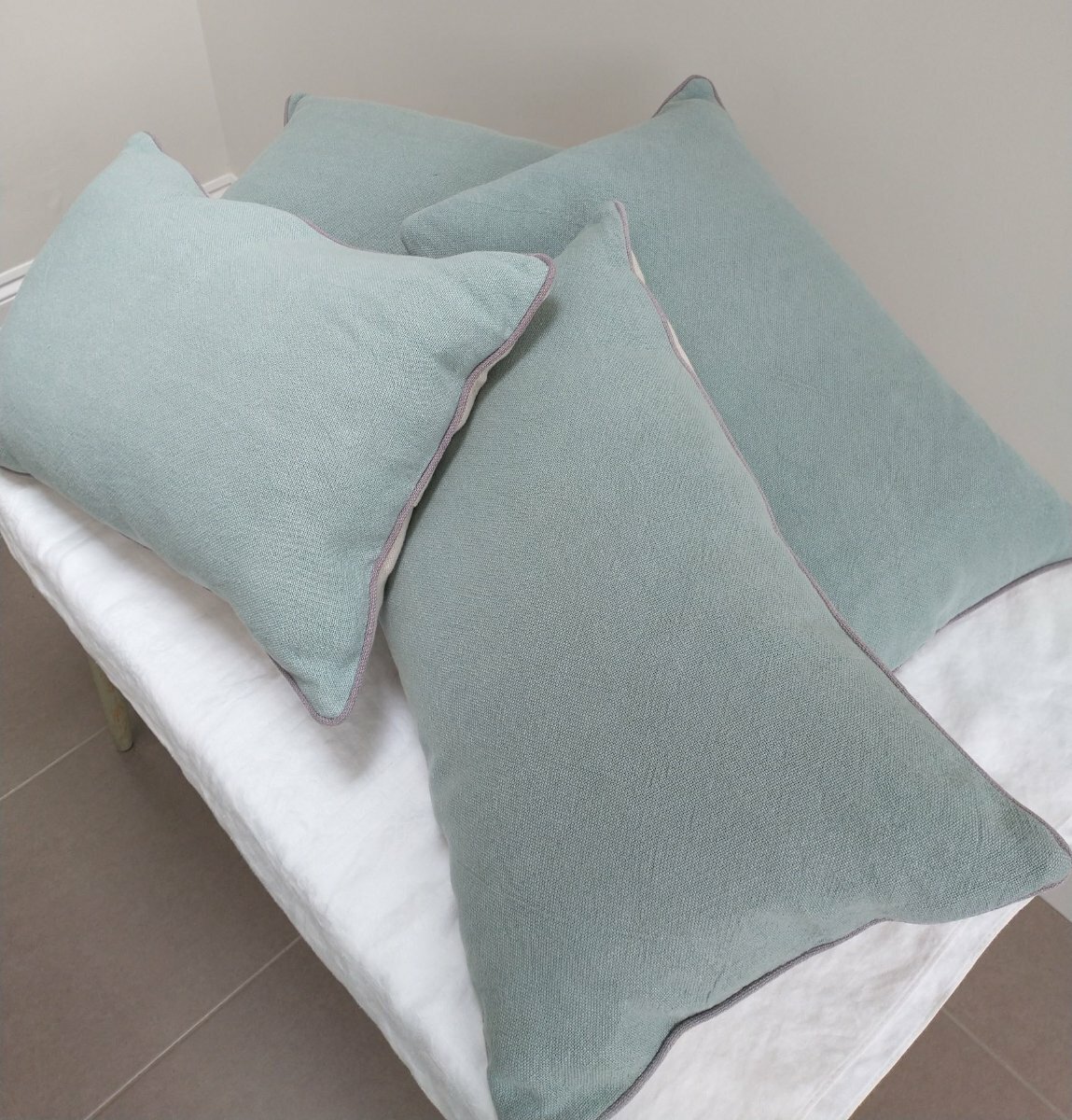 1) M&S 100% linen, with duck feather filling. Duck egg blue, with lilac piping detail and natural linen colour on reverse. Each cushion is 60cm by 40 cm. Four cushions, £20 for the set please