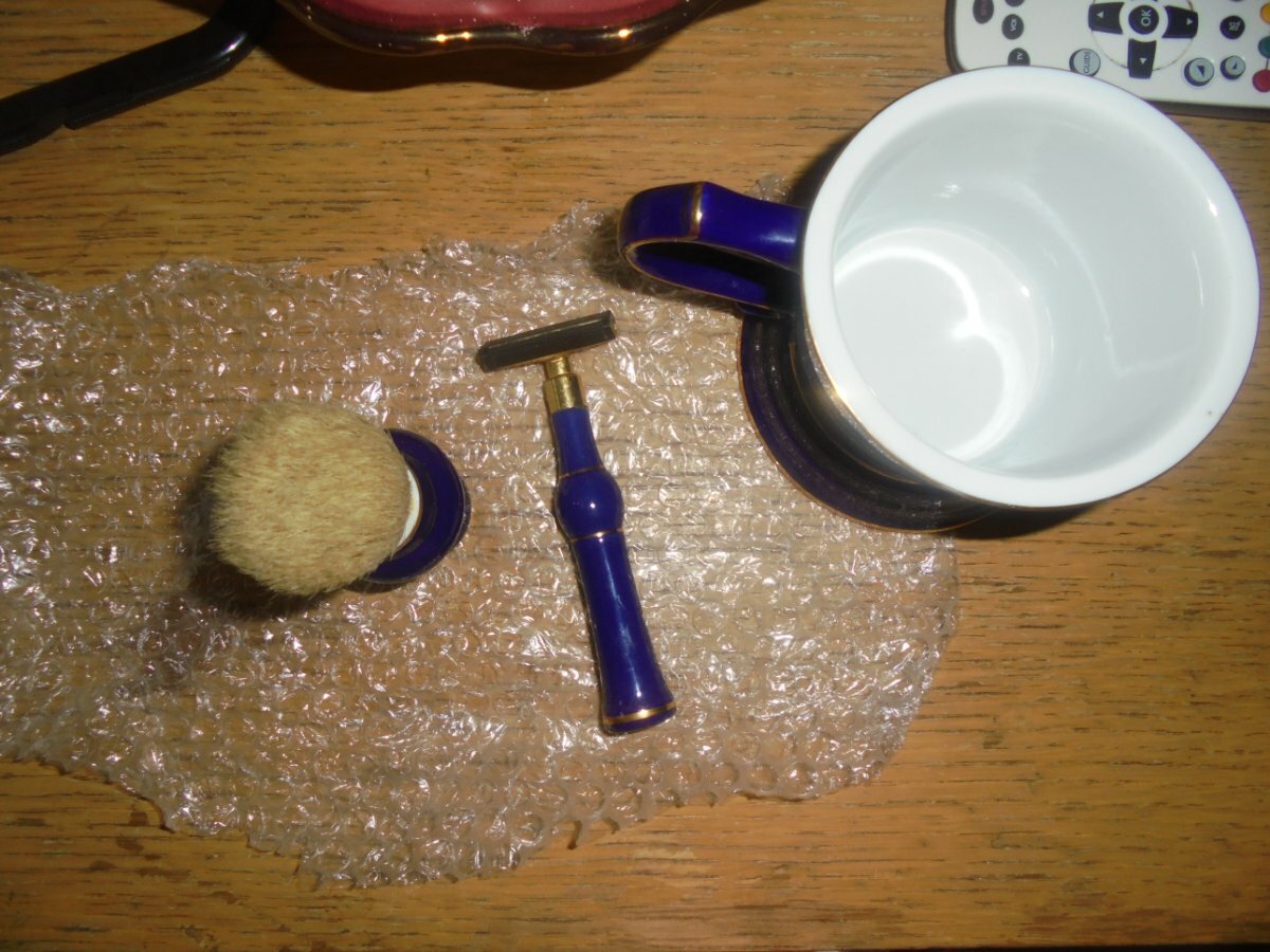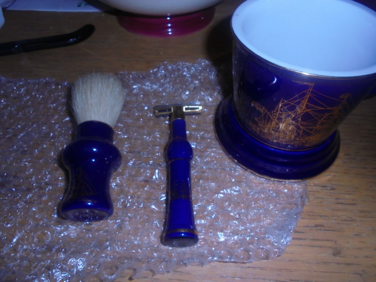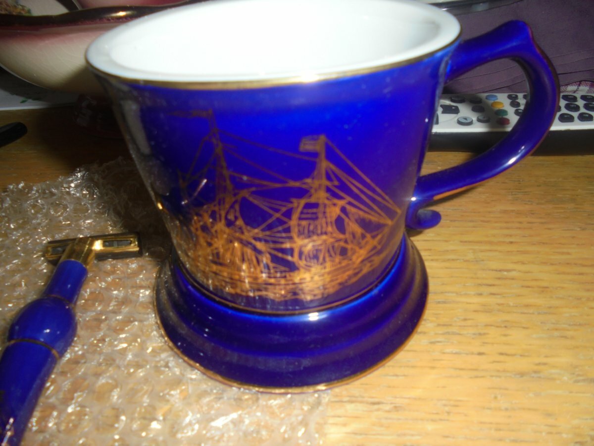 Vintage Shaving Mug, Brush & Razor.  Lovely Cobalt Blue colour with Gold coloured Galleon Design.  Height of Mug: 10cms.