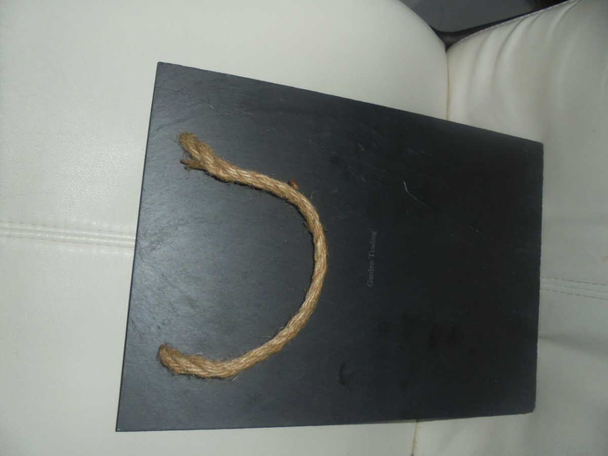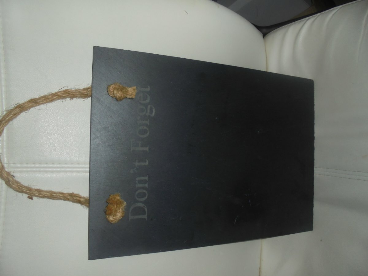 Heavy Slate Board with "Don't Forget" etched on it from Garden Trading.  Straw handle for hanging.  There is a scratch on the front and back.  H: 35cms. W: 25cms.