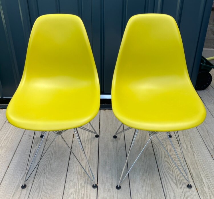Two mustard colour Genuine Eames DSR chairs manufactured by Vitra. Heavy plastic seat with chrome legs, bought from John Lewis in 2018. In very good condition and sturdy, showing only a few very minor marks consistent with use (see photos).
