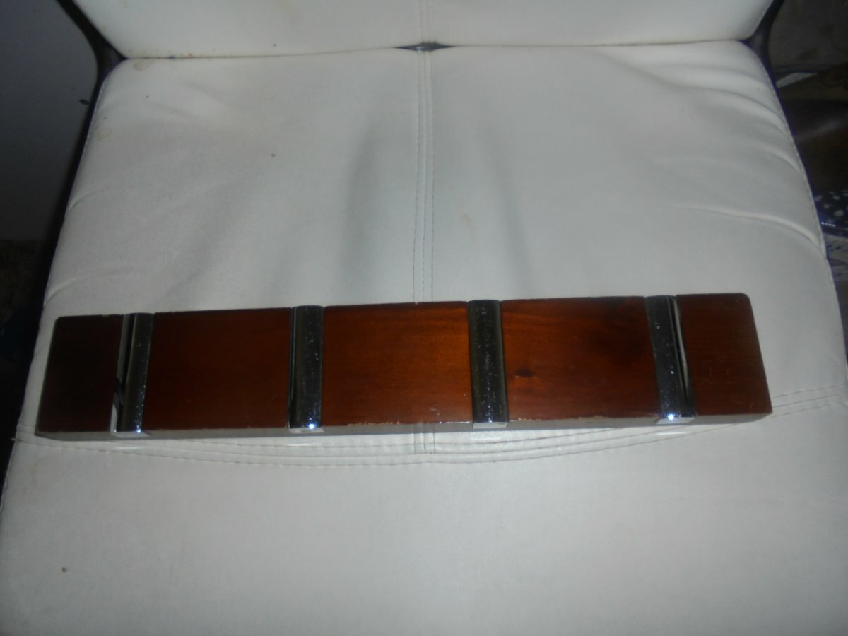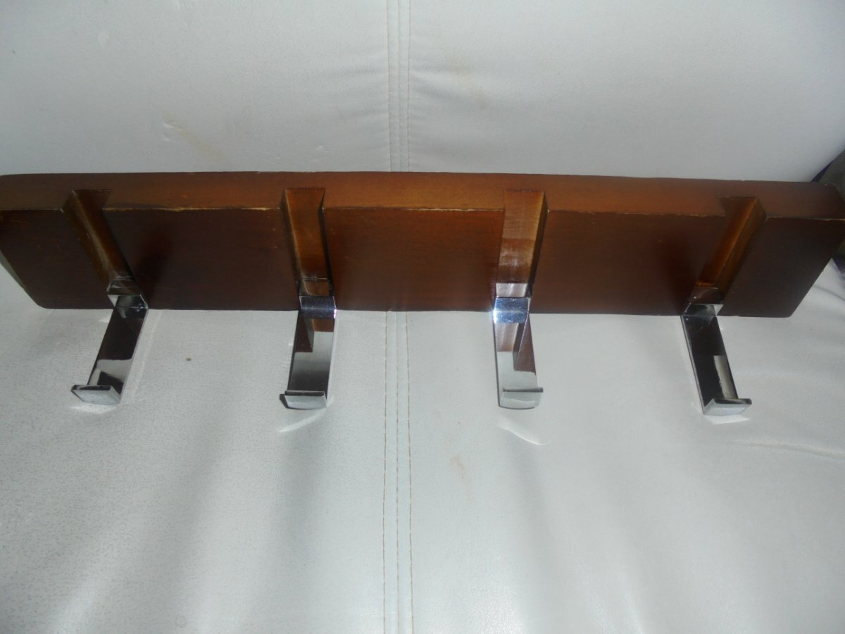 Small Wooden Coat Rack with Chrome Arms.  The arms fold away when not in use,