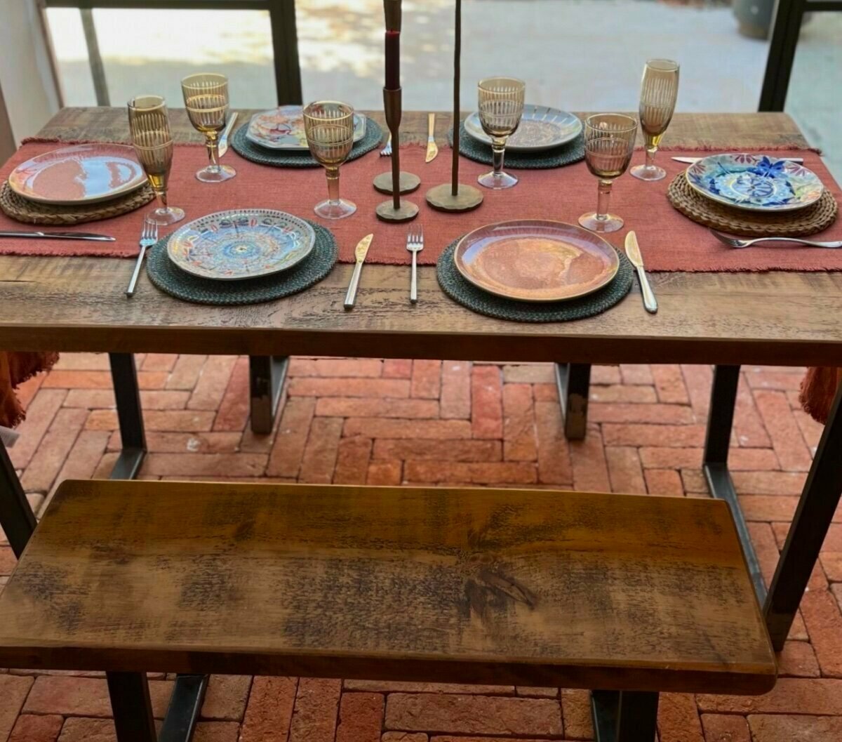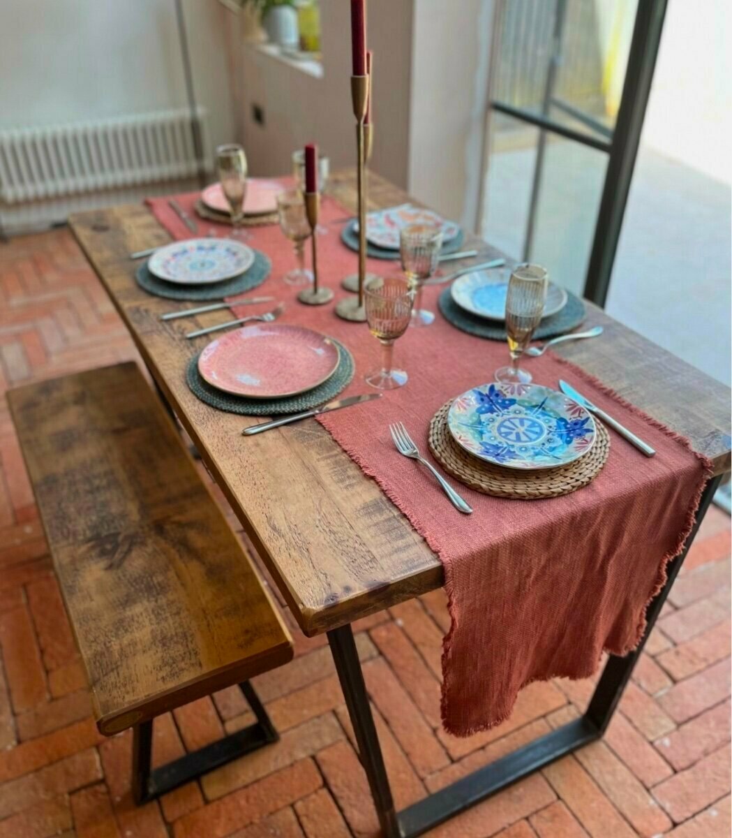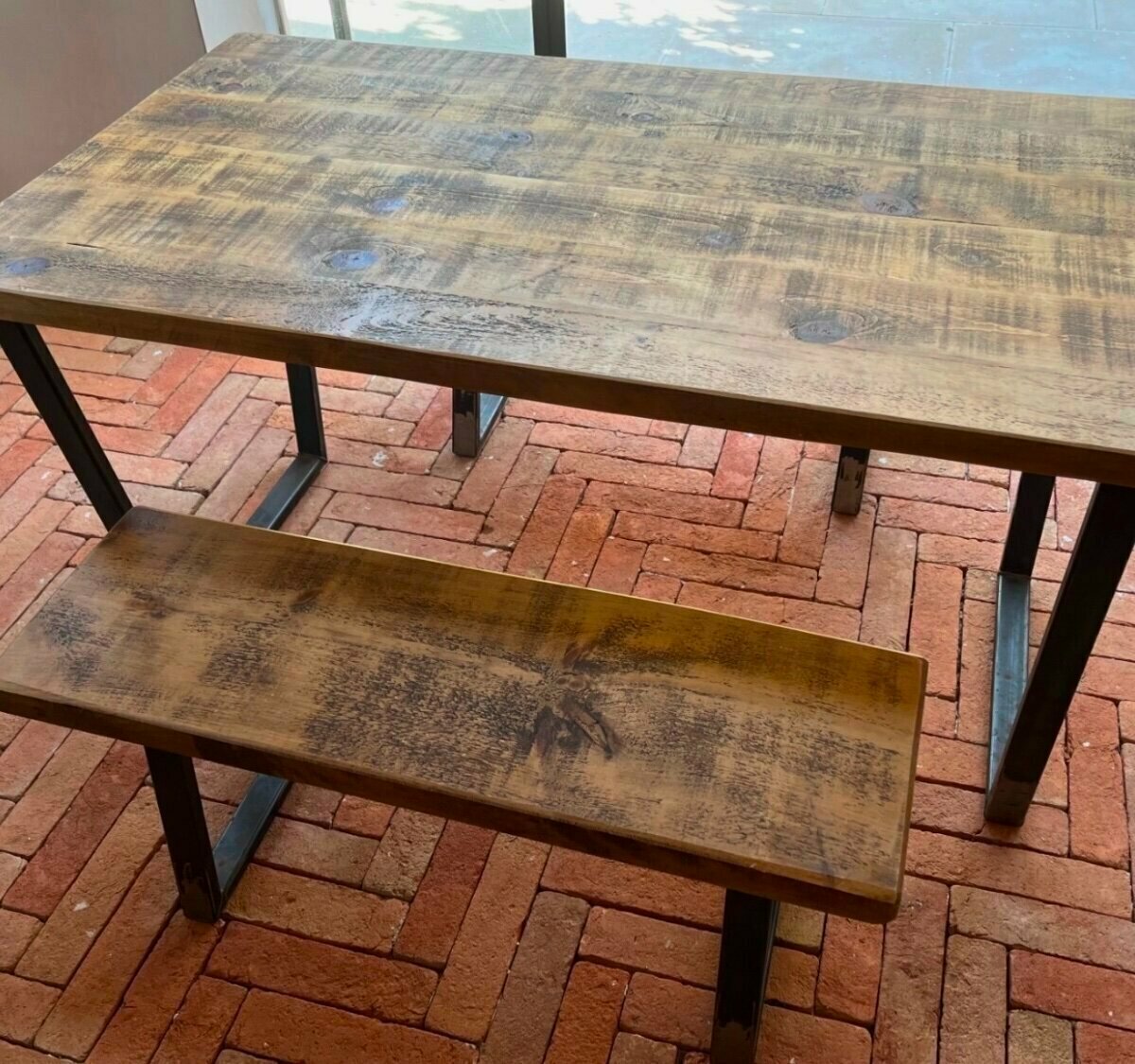 Really nice solid wood table with steel legs. 2 matching benches, handmade in England in a similar style to the John Lewis Calia range (but nicer in my opinion).