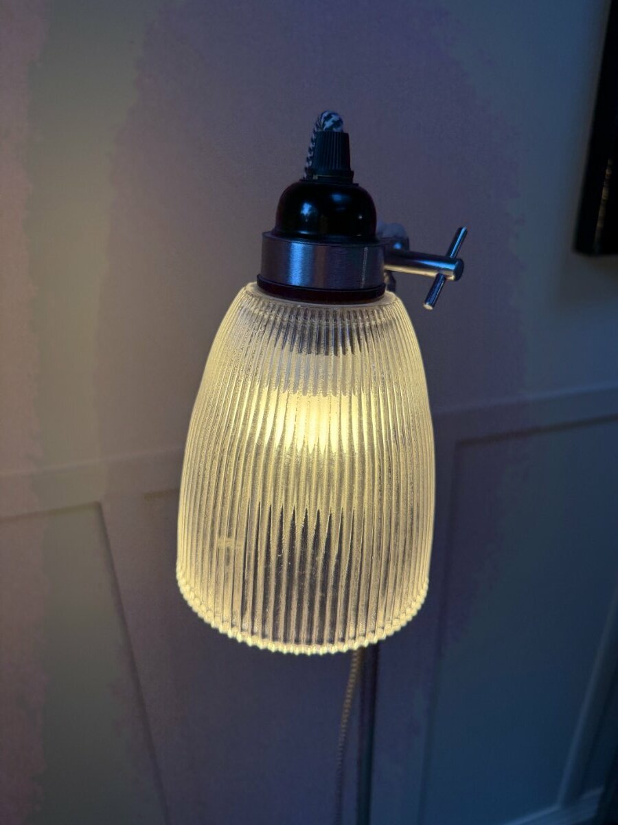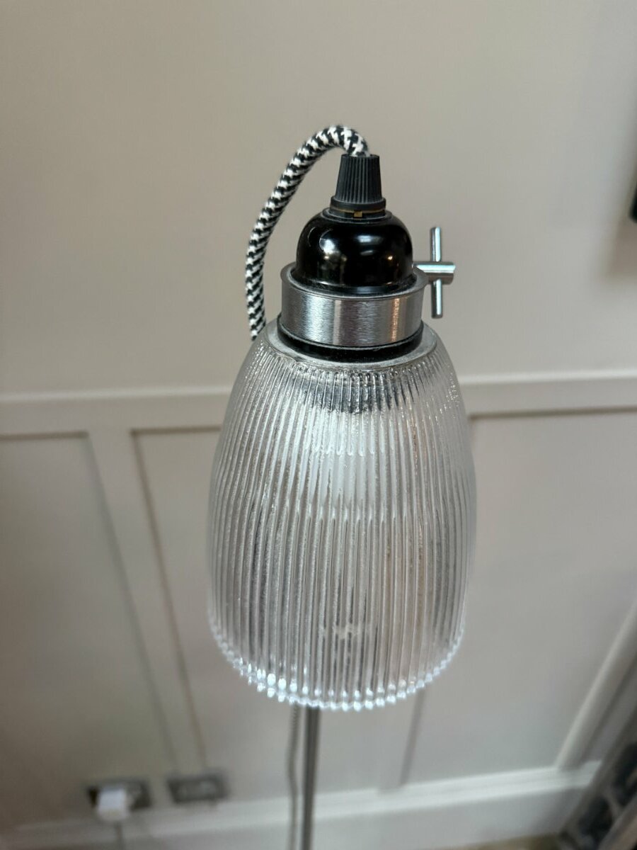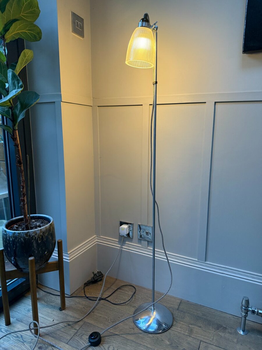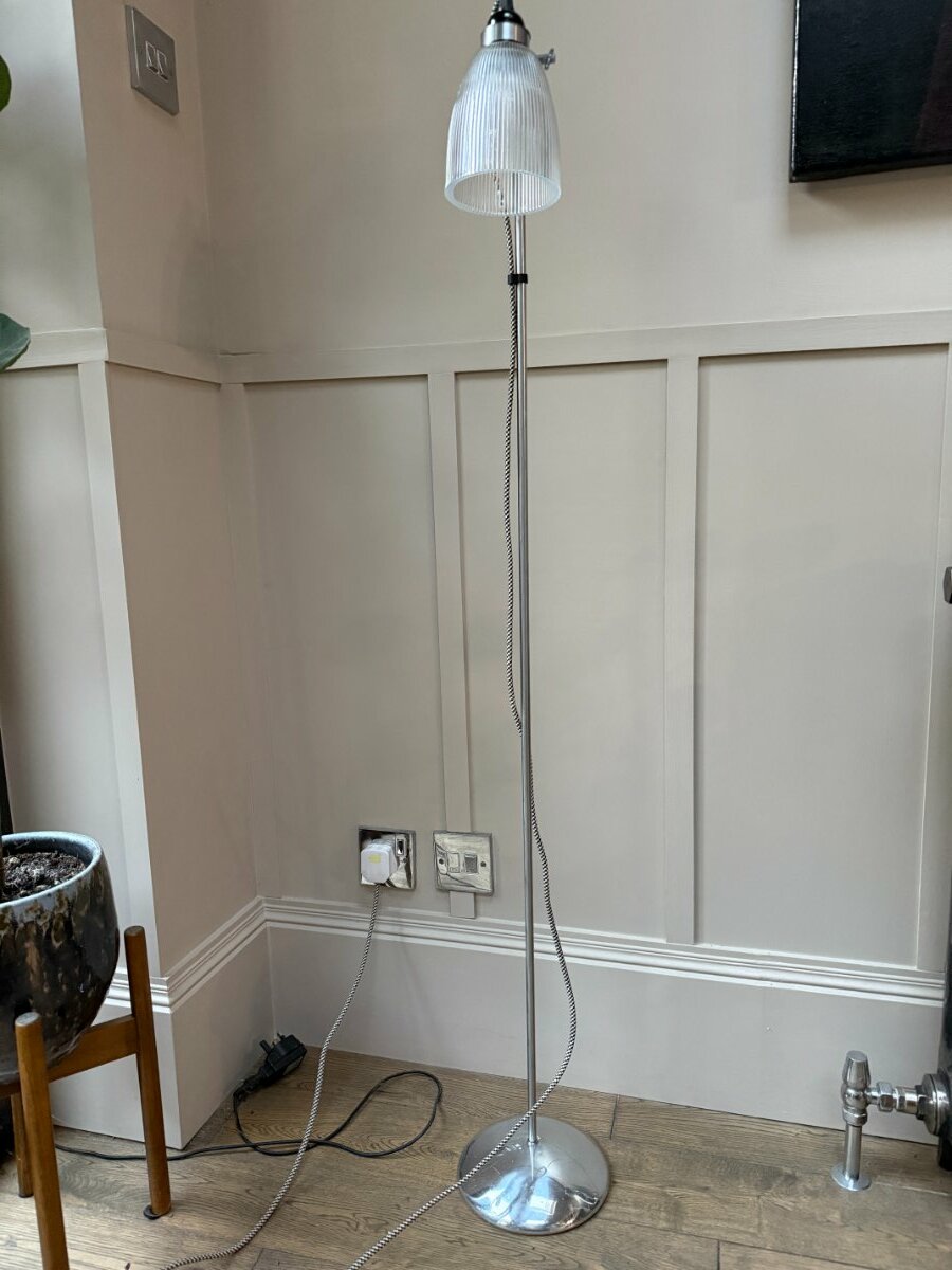 Orignal BTC Primo floor light in satin chrome and prismatic shade £75