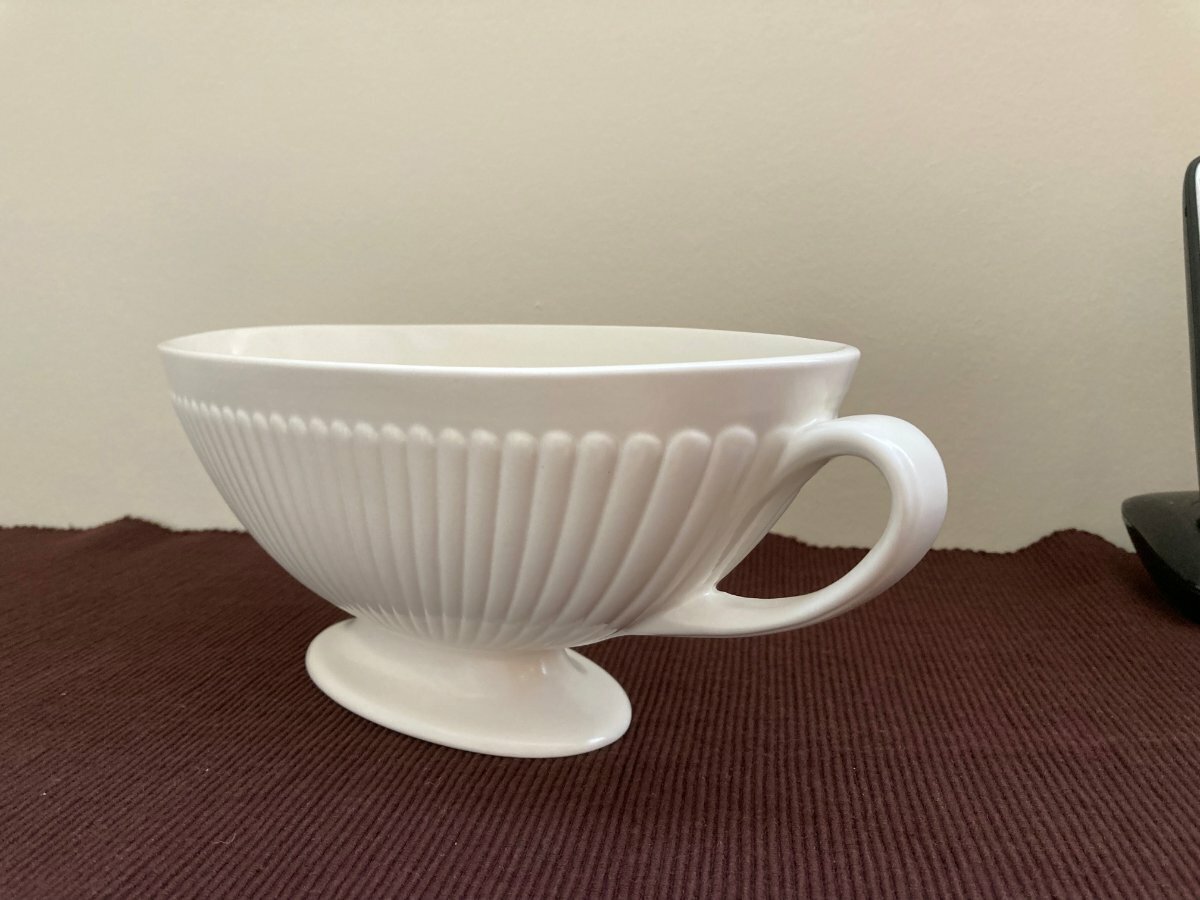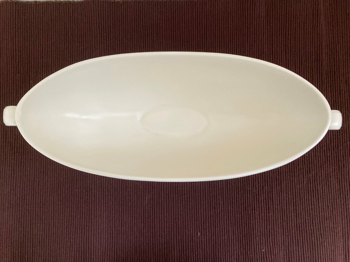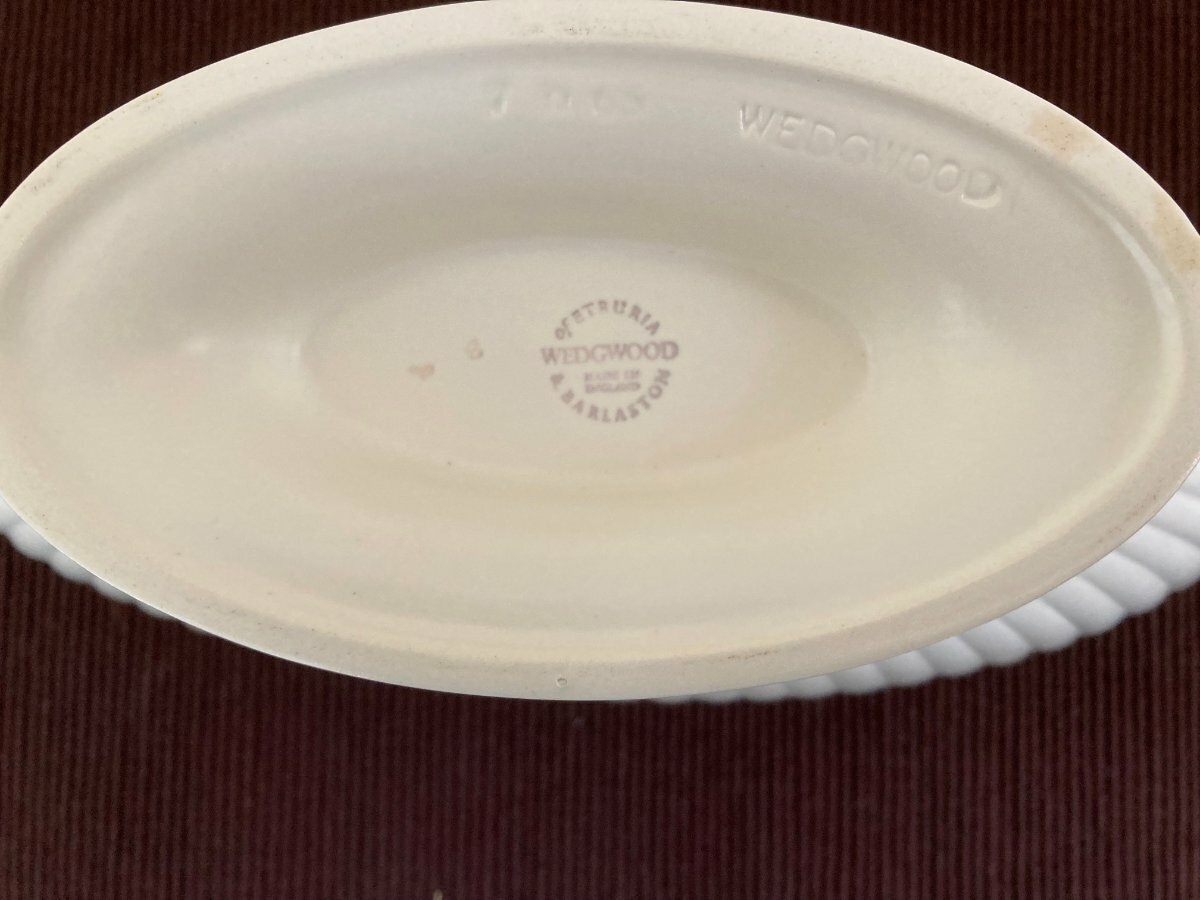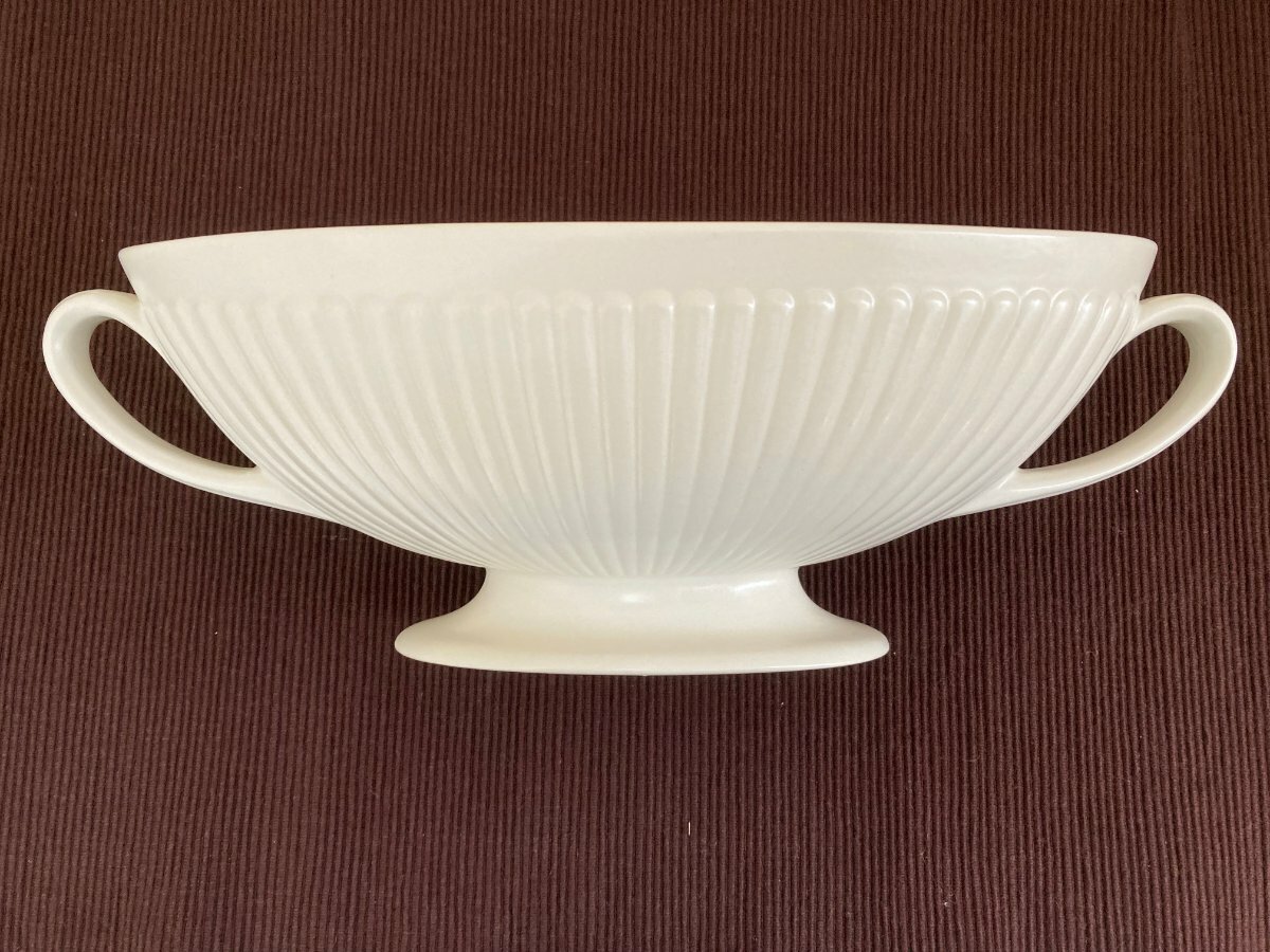 This is a beautiful Wedgwood of Etruria & Barlaston oval vase, made in the 1980s from white ceramic, and featuring two handles with a fluted ribbed bowl on a raised, footed base. It is marked on the base with the Wedgwood of Etruria & Barlaston stamp. The vase is a fine example of classical Wedgwood craftsmanship in very good condition, with no chips, cracks or crazing. Dimensions: 30cm long (from handle to handle); 10.5cm wide; 10.5cm high.