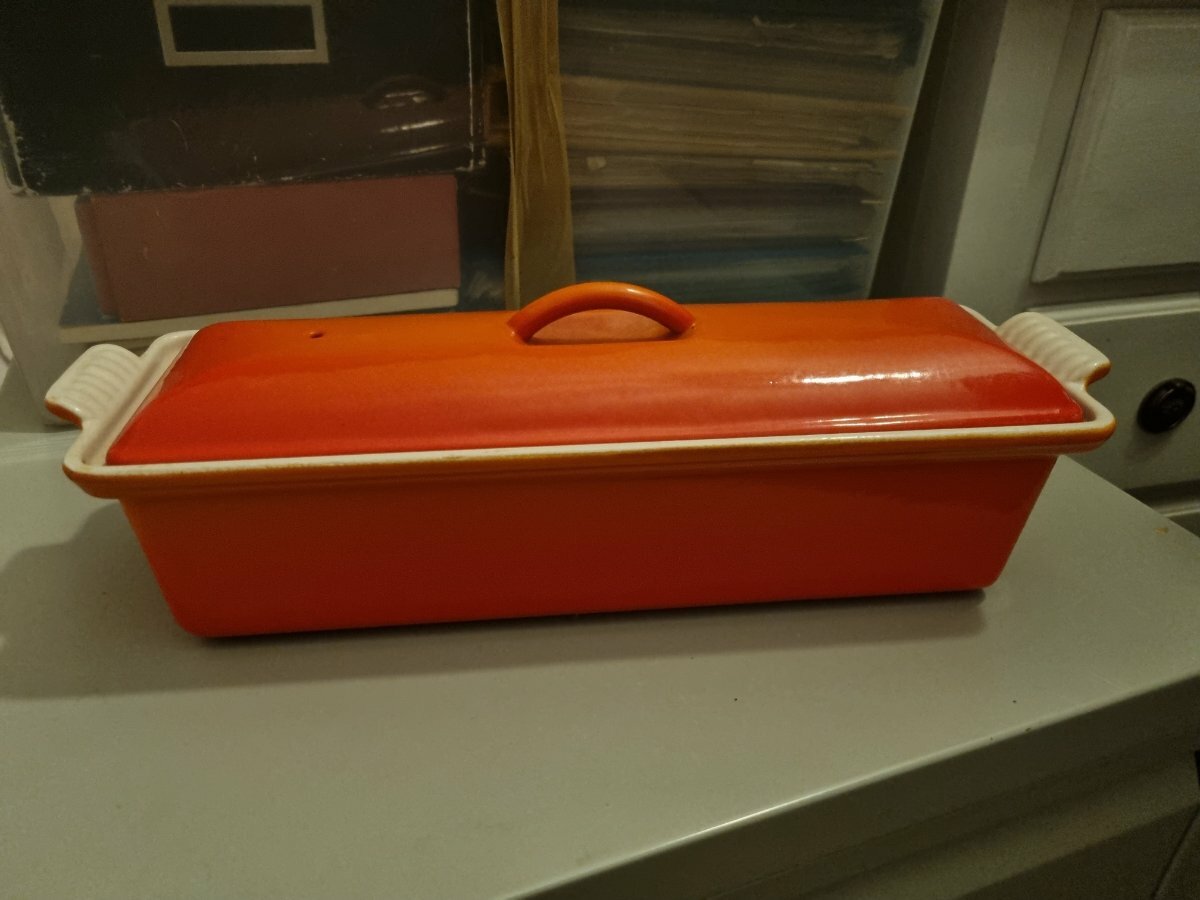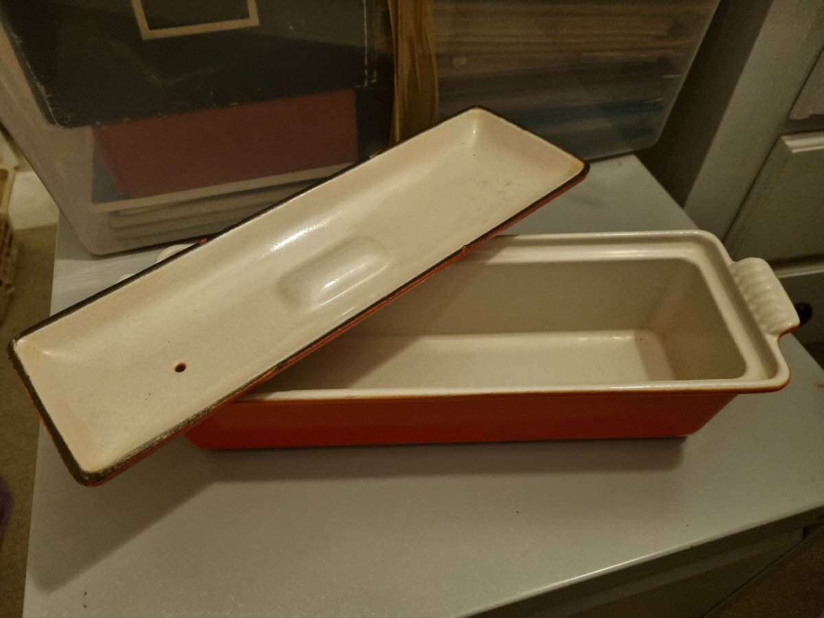 Due to downsizing this lovely pristine terrine is for sale.  Dimensions:  32 L (excluding handles) x  11 W  x 8 D (base) - including handled lid , approx 8D.