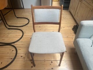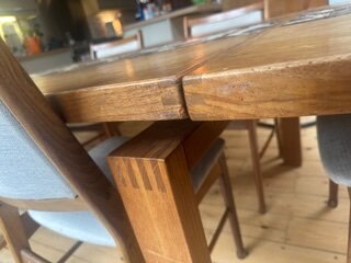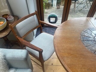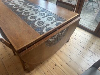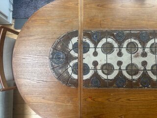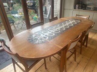 Mid century dining room table and six chairs. Italian tiled centre line. Perfect for hot dishes. Extendable / foldable ends.