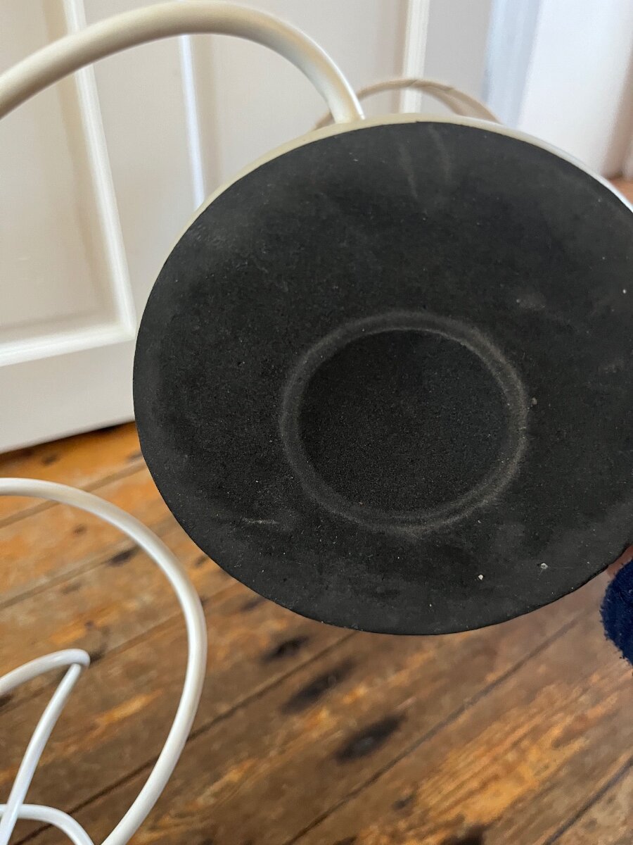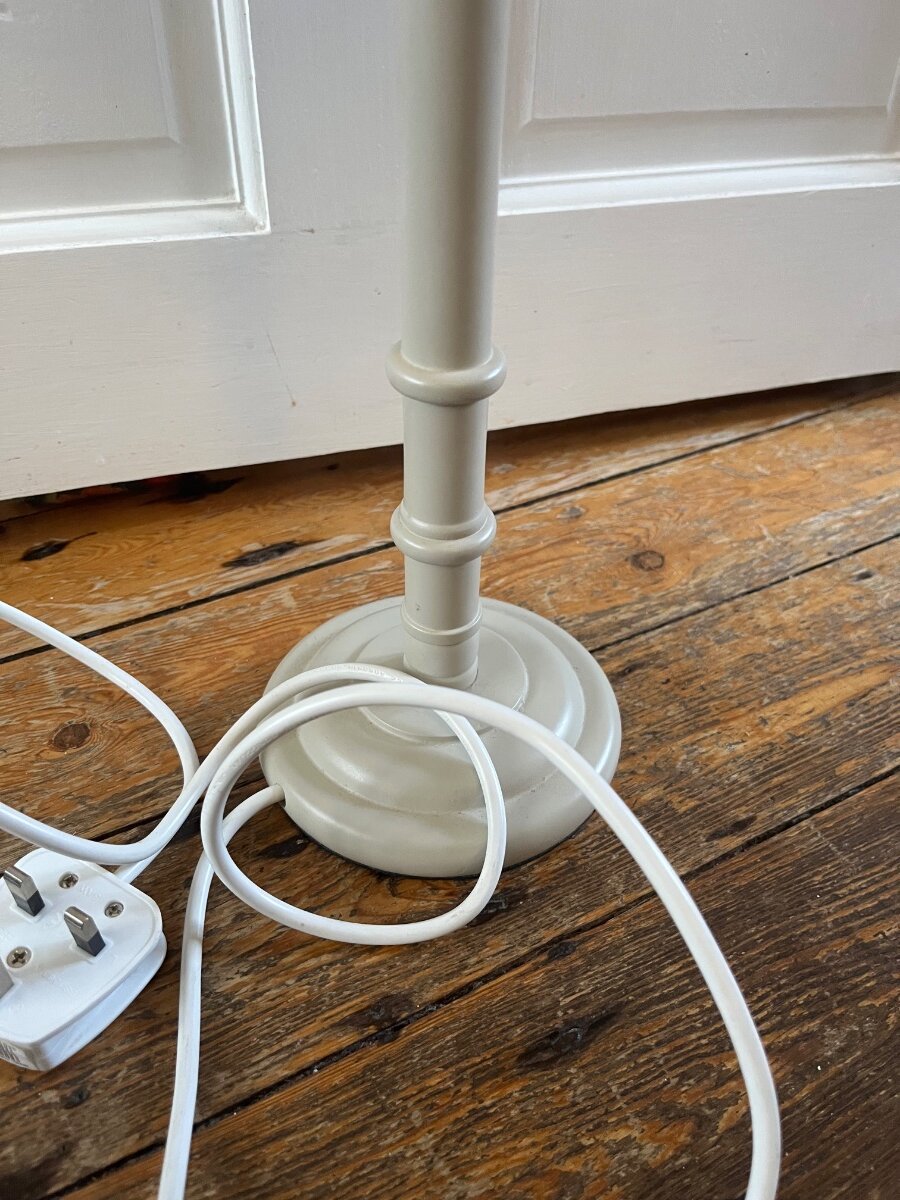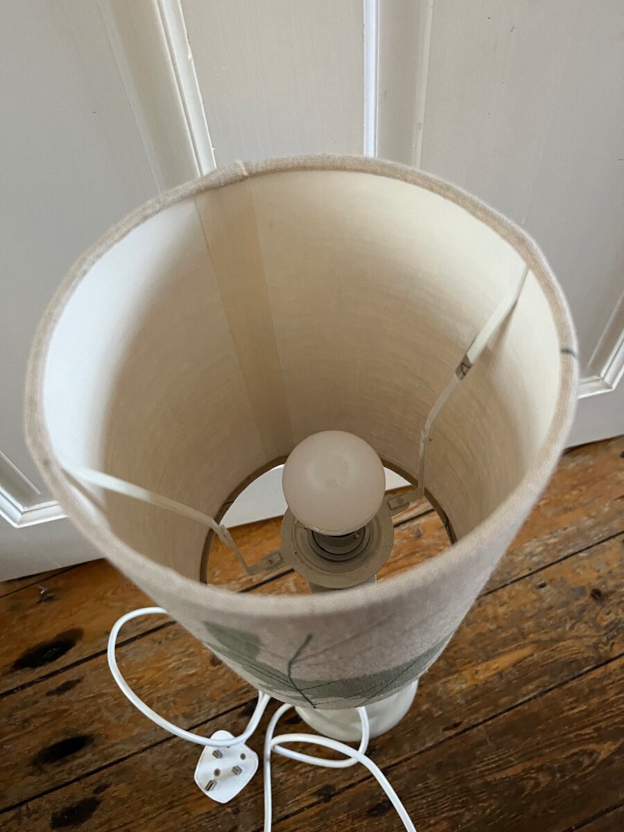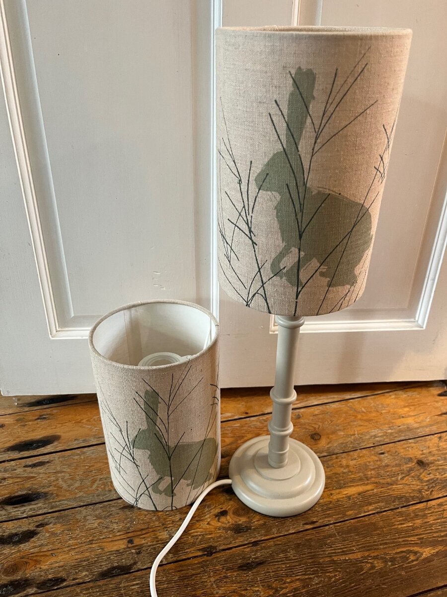 Bought from Jane Newbury in Dulwich Village some years ago. Lamp stands approx 21 inches in height with attached lampshade. Lampshade for ceiling light stands approx 9 inches in height. Shade is a beige linen effect with green hare and the stand is a duck egg green/grey colour. New lightbulb just been inserted.