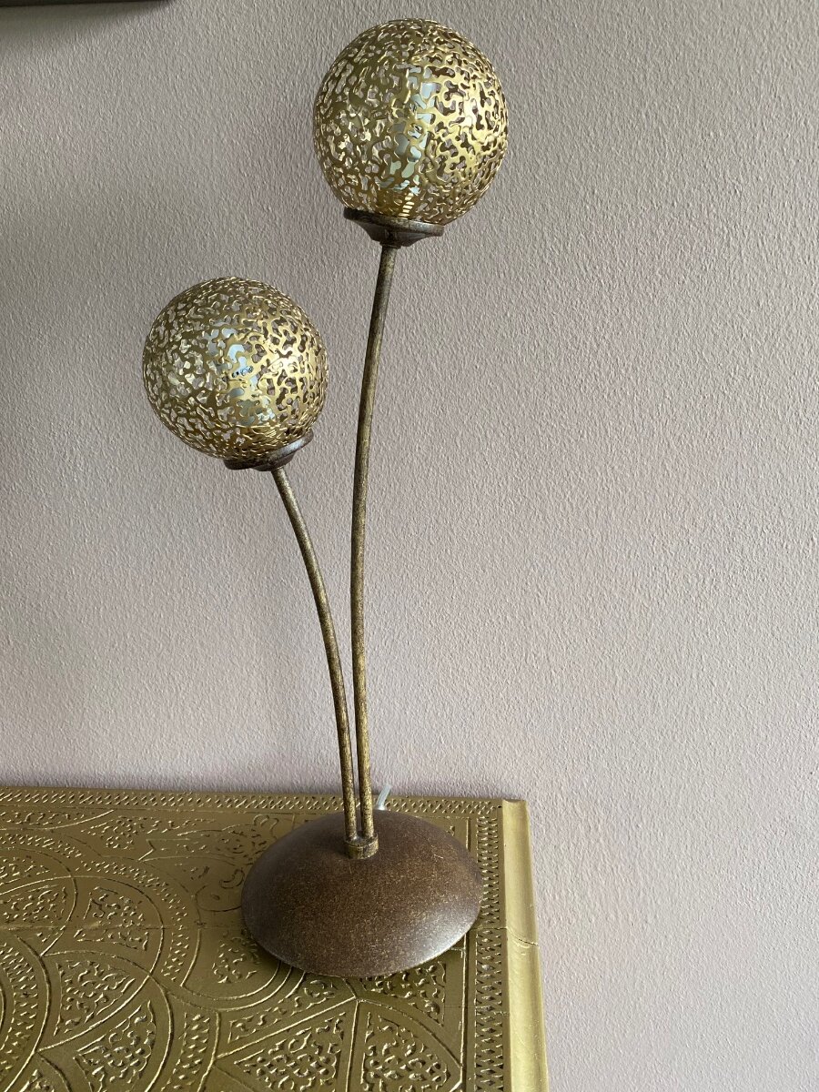 It features two hollow patterned globe shades in a dark bronze colour.  It will bring an exotic touch to any decor from classic to contemporary.