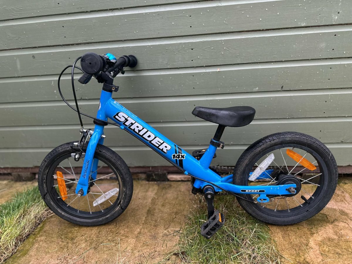 Gently used Strider 14x bike in great condition. Bought new for £189. My daughter originally used this as a balance bike with foot pegs. We later converted it to the pedal bike and my daughter learned to ride very quickly at the age of 3-4 years old. I will provide the foot pegs that originally came with the bike to convert back to balance bike.