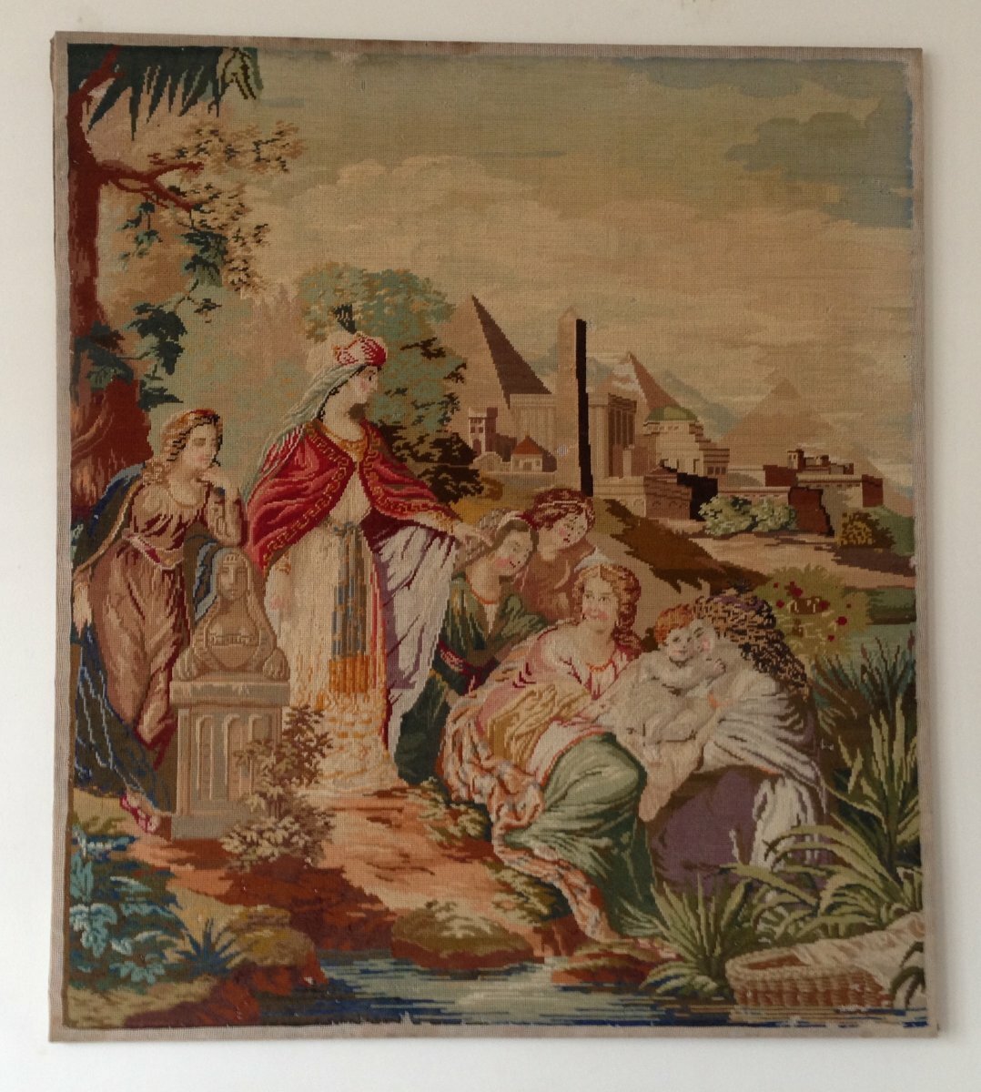 A large, antique, Berlin type woolwork embroidery panel with a religious scene of Moses in the Bulrushes which shows the finding of Moses by the Pharaoh's daughter. It is also known by the titles: The Finding of Moses, or Moses Saved from the Waters. It was a popular art subject matter. The Egyptian princess and her attendants are seated and standing by a river around the baby Moses. Classical buildings appear in the distance with a sphinx garden statue on a pedestal by the princess to reference Egypt.
