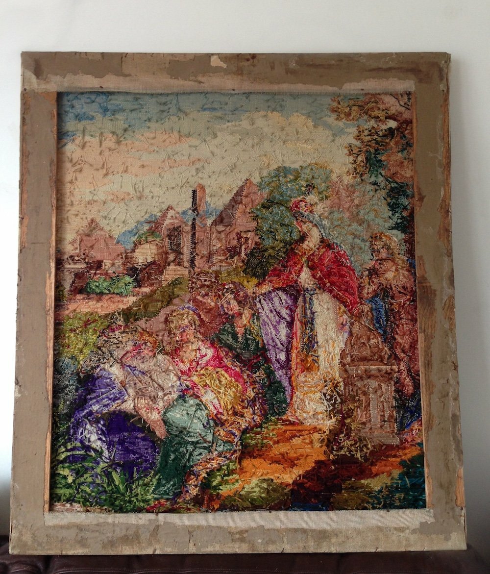 Tapestry on wooden frame support.