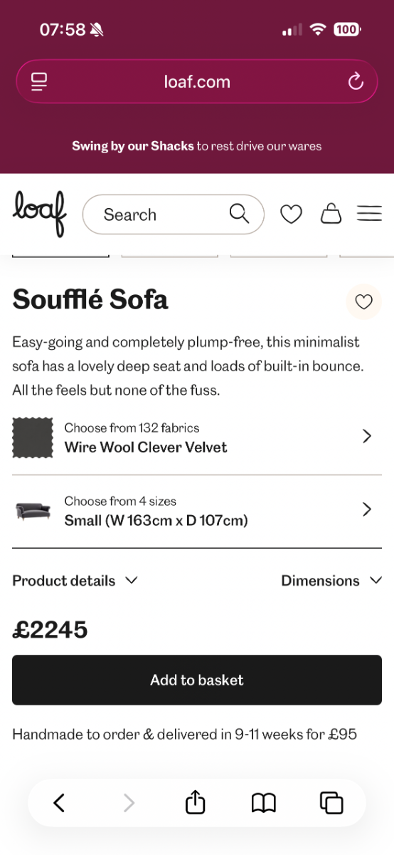 frances246 Posted Sunday at 08:07 Share Posted Sunday at 08:07 Loaf soufflé sofa - good condition Covered in dark grey clever velvet which makes spot cleaning easy Dimensions 165cm L x 107cm D Loaf are handmade sofas with long lasting bounce - this one does not have separate seat cushions so no plumping required. £2245 RRP - selling for £300 ONO Comes from a smoke free home Collection from SE22 Link to comment https://www.eastdulwichforum.co.uk/topic/371027-for-sale-loaf-souffl%C3%A9-sofa-in-clever-velvet/ Share on other sites More sharing options...
