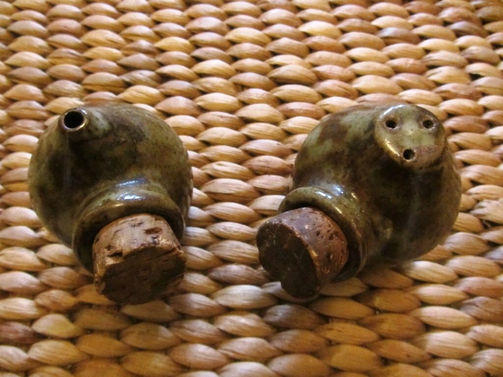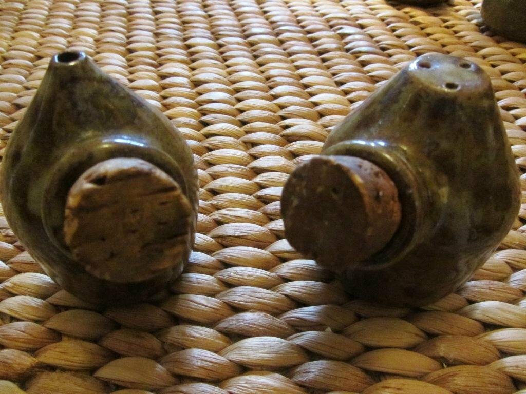 For sale: £8 each set - 2 sets of vintage Aylesford Pottery cruet (salt & ground pepper) with cork stoppers – very good condition