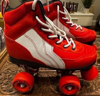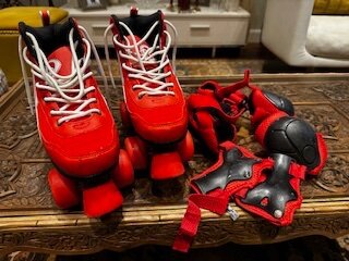 For sale hardly used red roller skates with protectors
