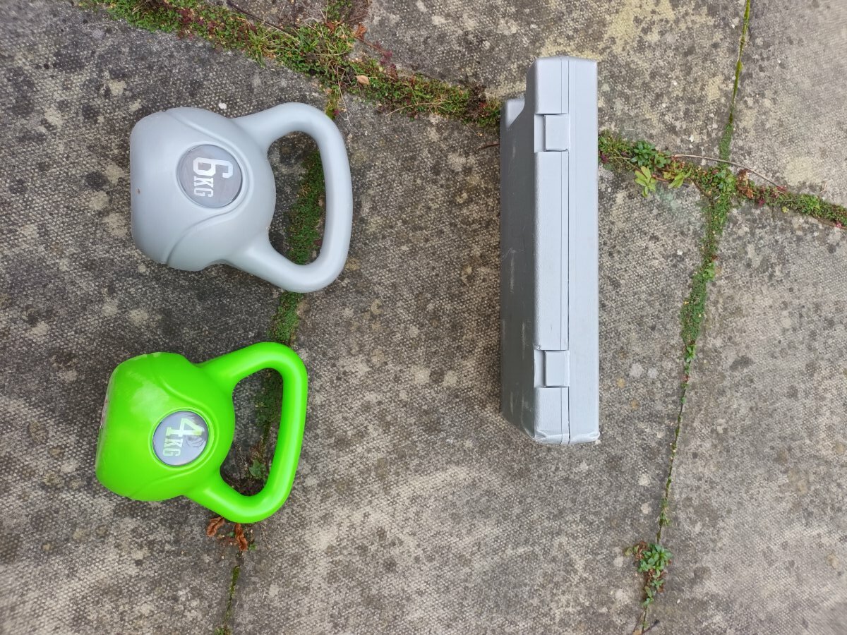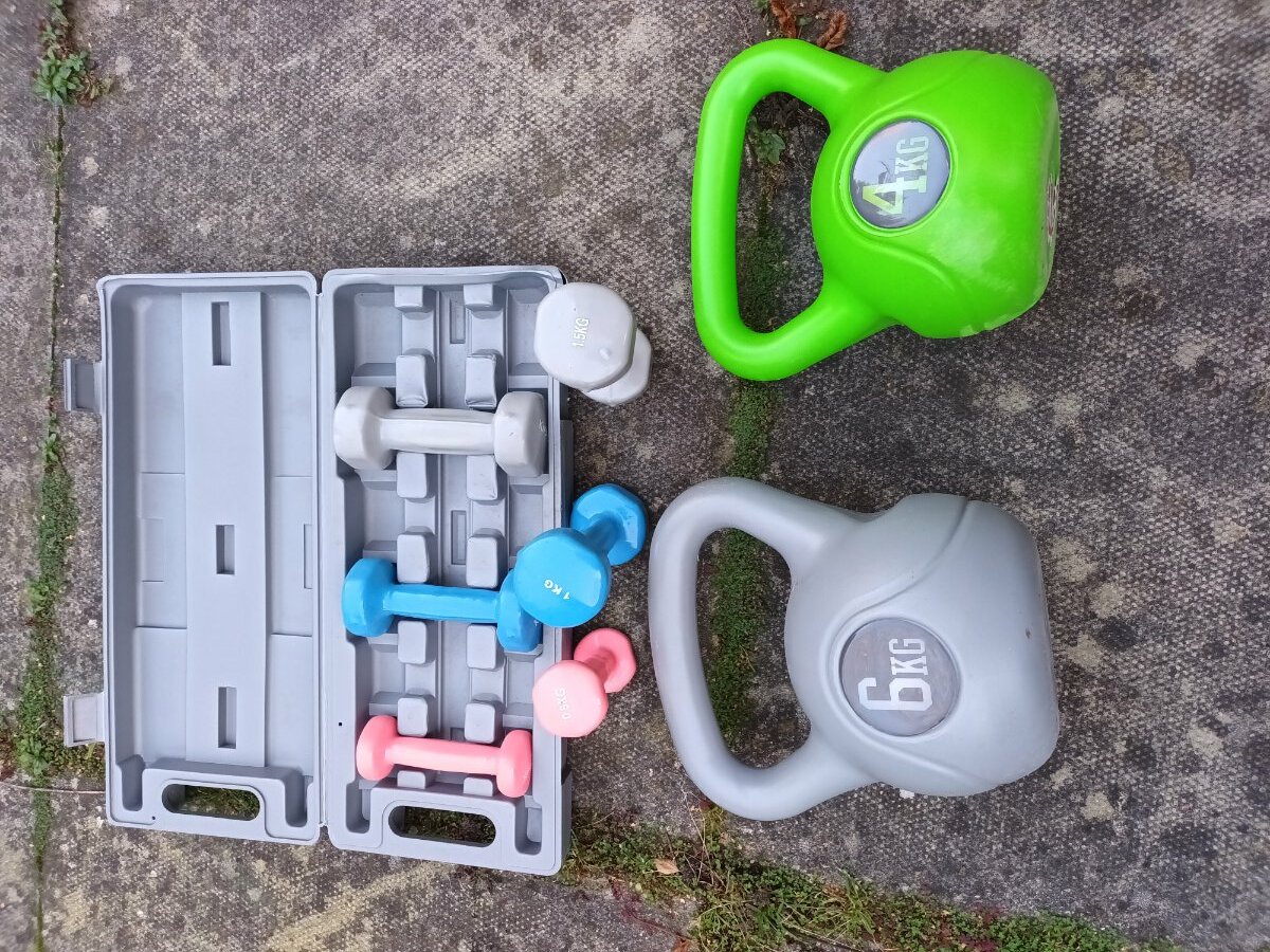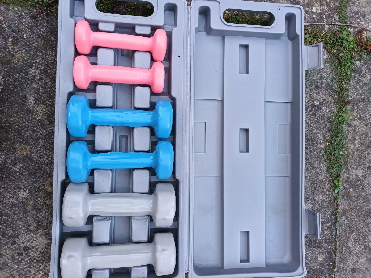 1 x boxed set lightish hand weights containing pairs .5kg, 1 kgand 1.5kg.  Great for starting out your strength and fitness or if you are returning to or recovering from an injury or illness.