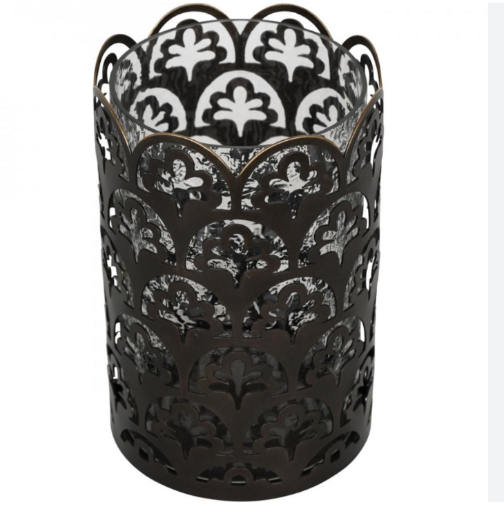Classic hurricane with clear hammered glass drum surrounded by intricate metalwork featuring Laura Ashley Musica pattern, finished in gilded bronze."