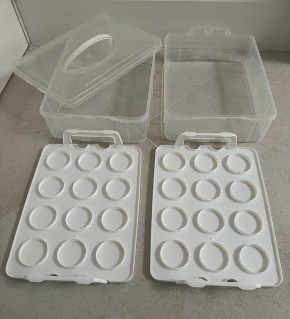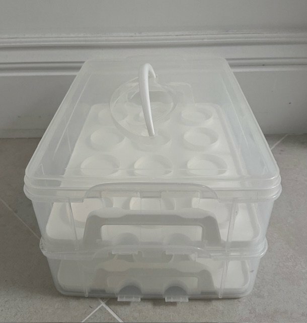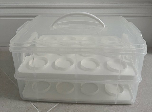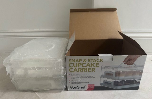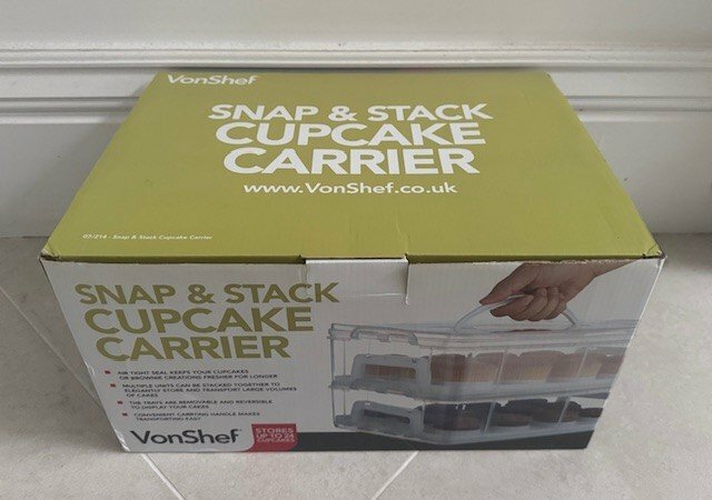 VonShef Snap & Stack Two-Tier stackable cupcake carrier in like-new condition and in its original box and packaging. It can be used to carry up to 24 cupcakes and muffins or to carry larger cakes by removing the individual moulded placeholders. Very versatile and super useful for bake sales, birthday parties and school fairs. Available for pick up from SE24. £18