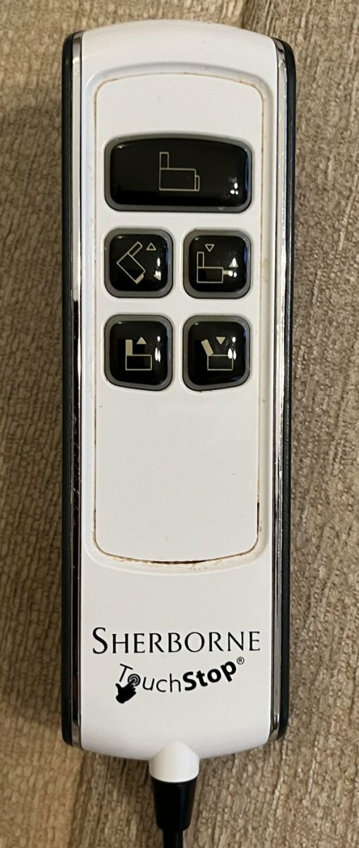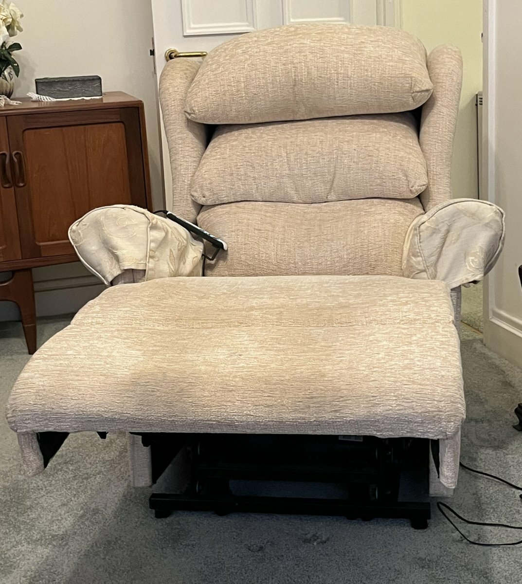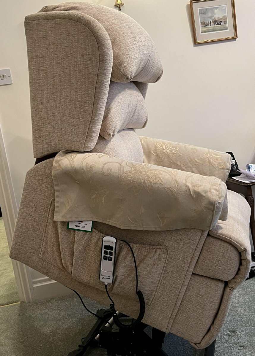 "Sherborne" electric reclining chair, ideal for the older or disabled person.  The back reclines;  the foot rest rises; together the back and footrest recline more or less flat; the chair can rise and tilt to assist the occupant to stand.  Used but in good condition. The movements are smooth and gentle, with simple "Touch Stop" controls. Solid and stable base, fire resistant fabric. Inspection welcome at SE24 9HS. Buyer collects.