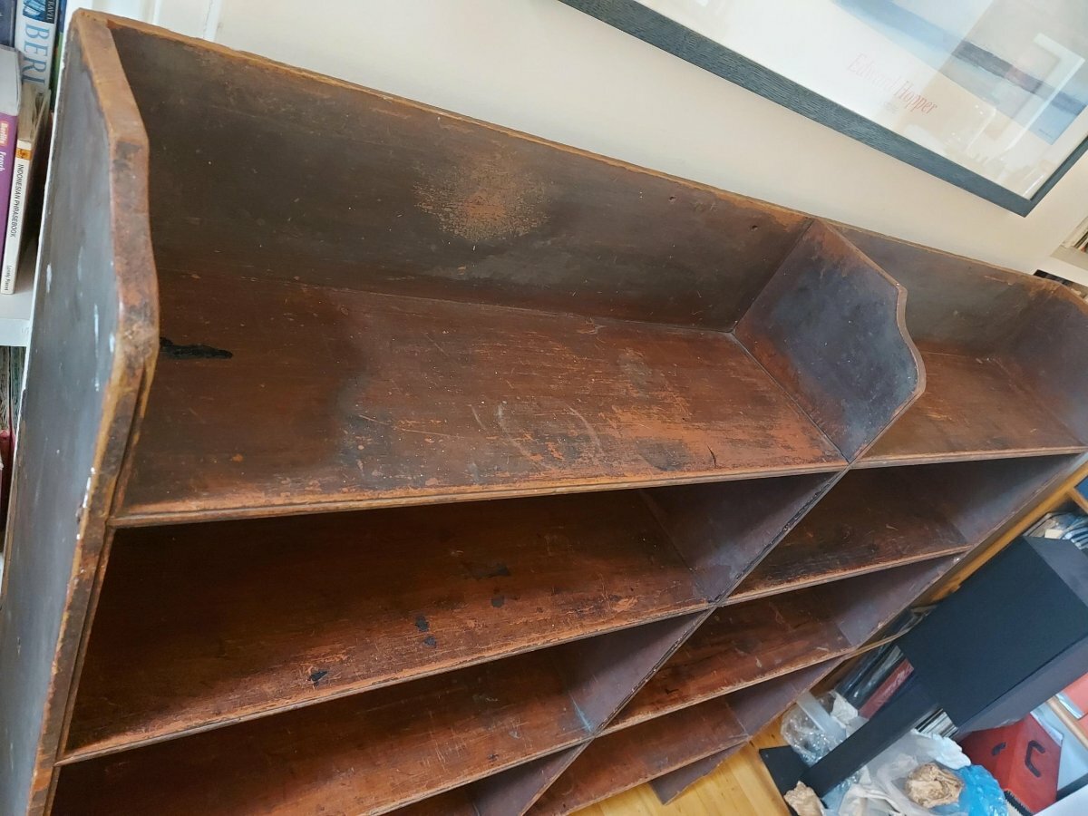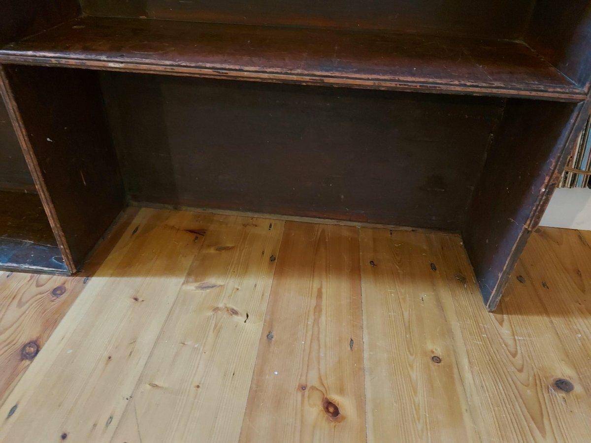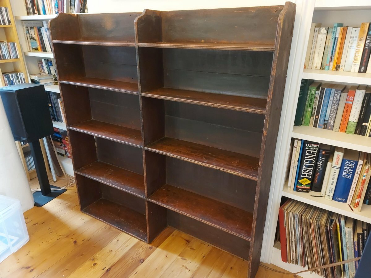 These characterful shelves are solid wood (possibly pine, varnished to look darker), and are in decent working order.