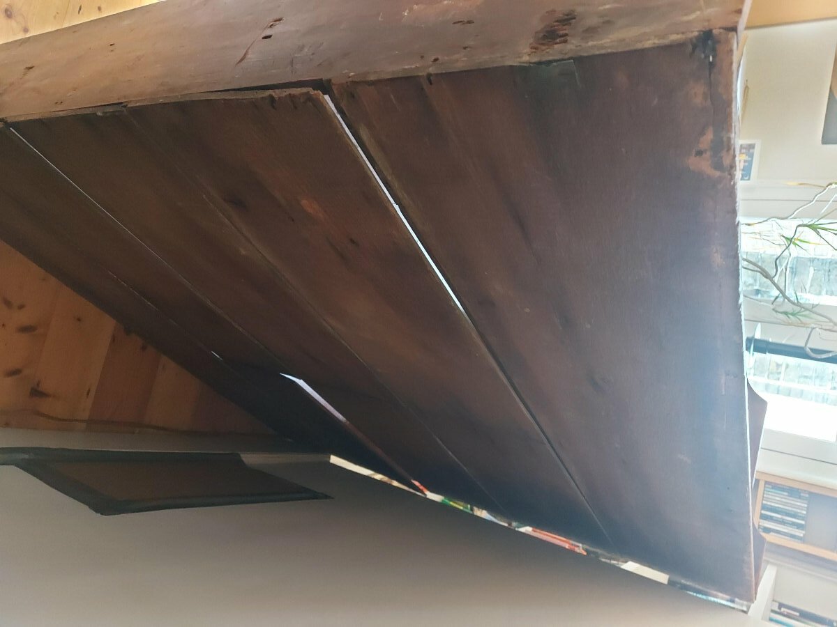 The base on one side is missing, and the wooden backing boards could do with an extra nail or two.