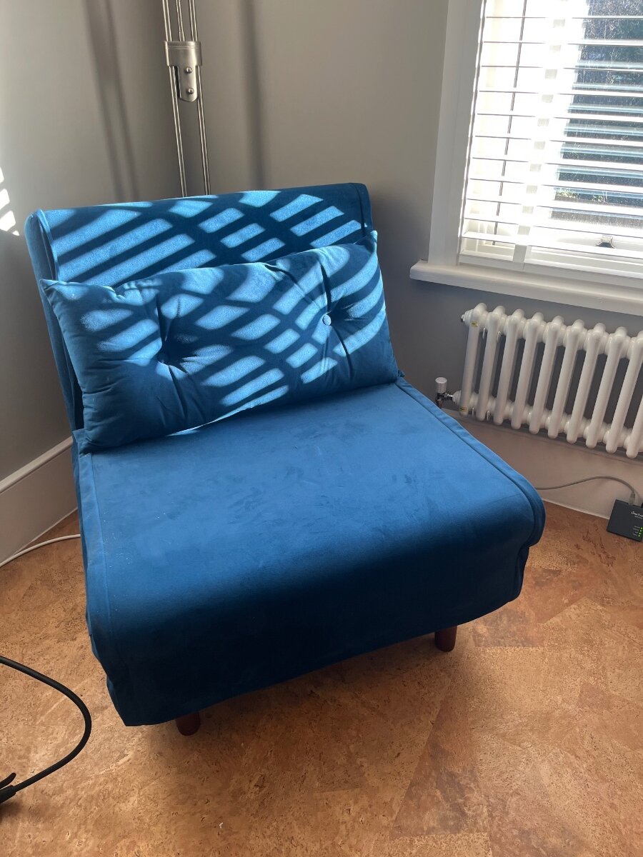 Fold out blue chair bed from Laura James. Original link here: