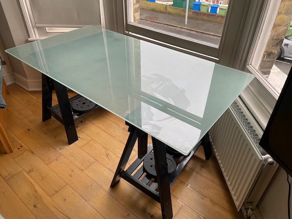 Toughened/laminated, frosted glass desk top (+ trestles)