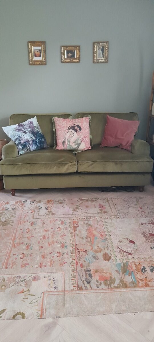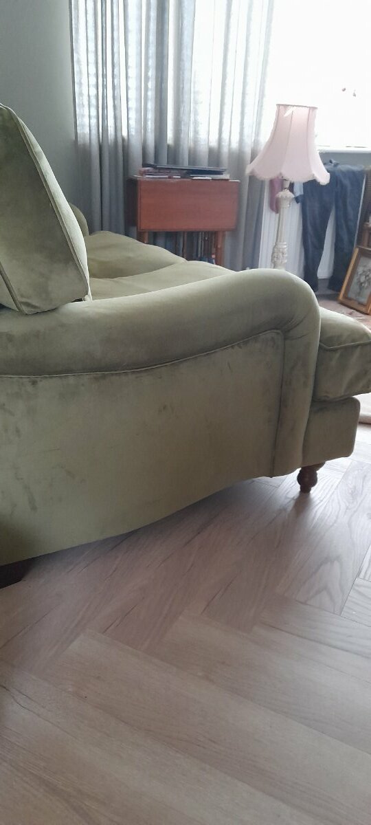 Gorgeous olive green 3 seater. So very comfortable. Took me a long time to find it. Its absolutely like brand new. Only used for 1.5 years by one person-me. Pet smoke airfreshner free home. Unfortunately I have to move and can't take it. Really upset to let it go. Have more photos can send