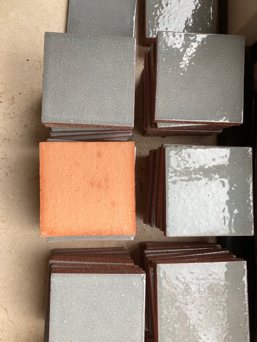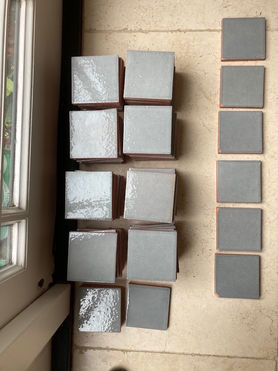 84 Handmade French tiles. 10 cm x 10 cm plus 6 with small chips at 1 corner. £20 for all