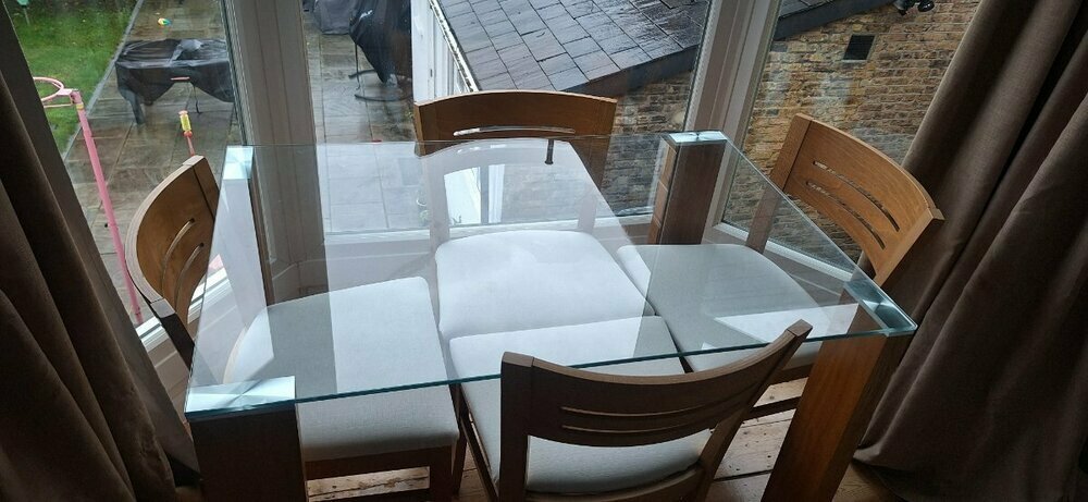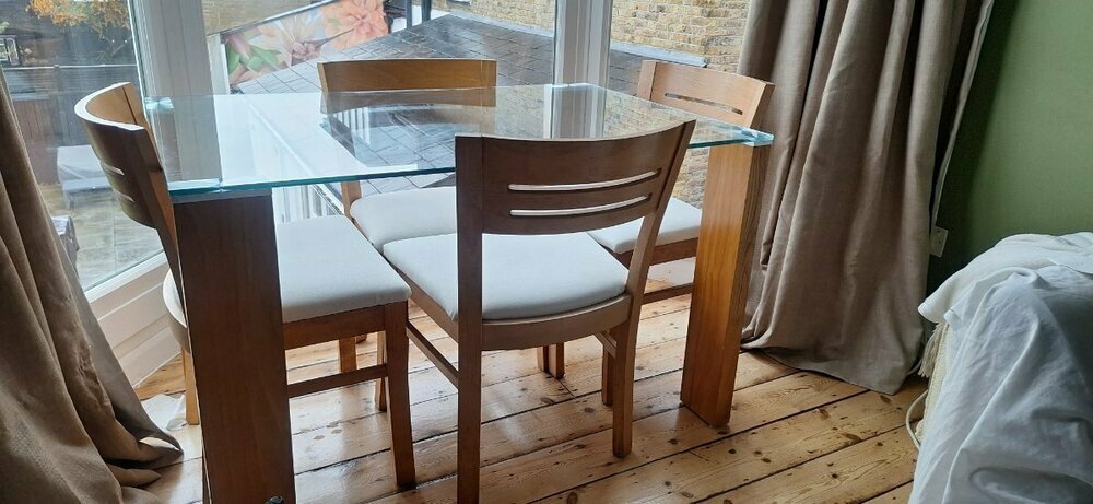 The chairs are second hand and diy reupholstered,  sturdy and perfectly matching the table. Showing some usual wear especially at the bottom of legs. The seat is nice and clean with no stains. (Non smoking house)